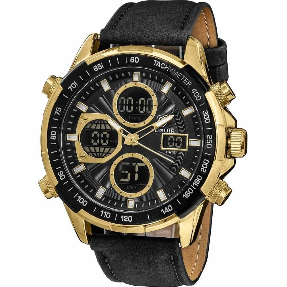 Funções: Anadigi, Iluminação, Calendário, Alarme, CronógrafoResistência à Água: 50mDiâmetro da Caixa: 46 mmCaracterísticas: com caixa em Metal e pulseira em Couro Ecológico CinzaVidro: Cristal MineralFundo de PressãoAlimentação do maquinário: BateriaMostrador GrafiteGarantia de 1 Ano