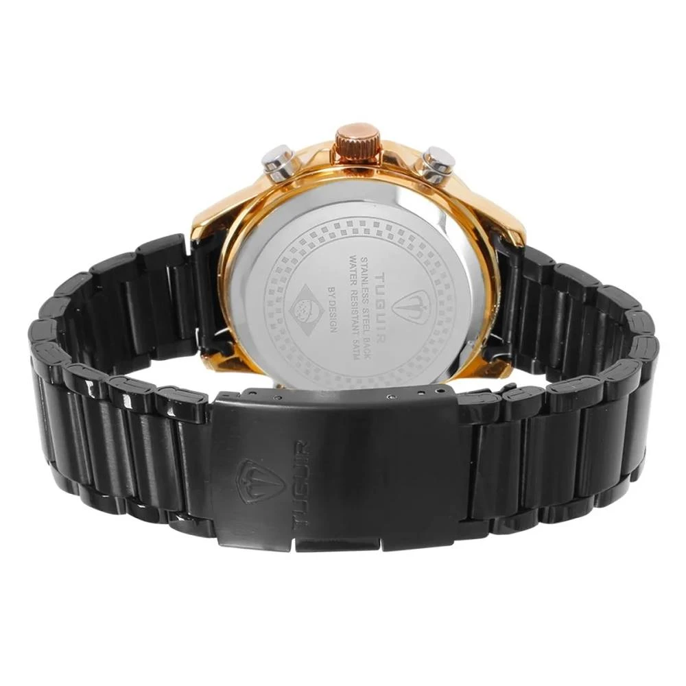 Funções: Anadigi, Iluminação, Calendário, Alarme, CronógrafoResistência à Água: 50mDiâmetro da Caixa: 46 mmCaracterísticas: com caixa em Metal e pulseira em AçoVidro: Cristal MineralFundo de PressãoAlimentação do maquinário: BateriaMostrador PretoRosé com PretoGarantia de 1 Ano