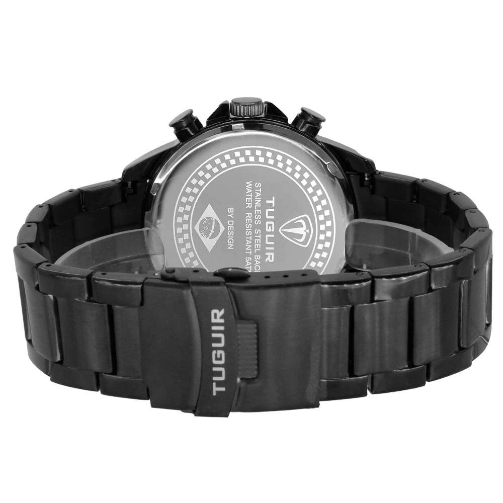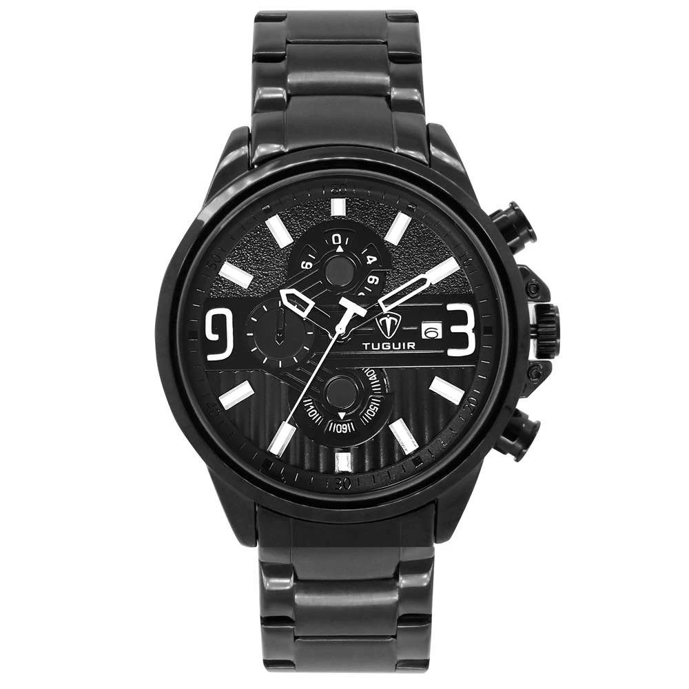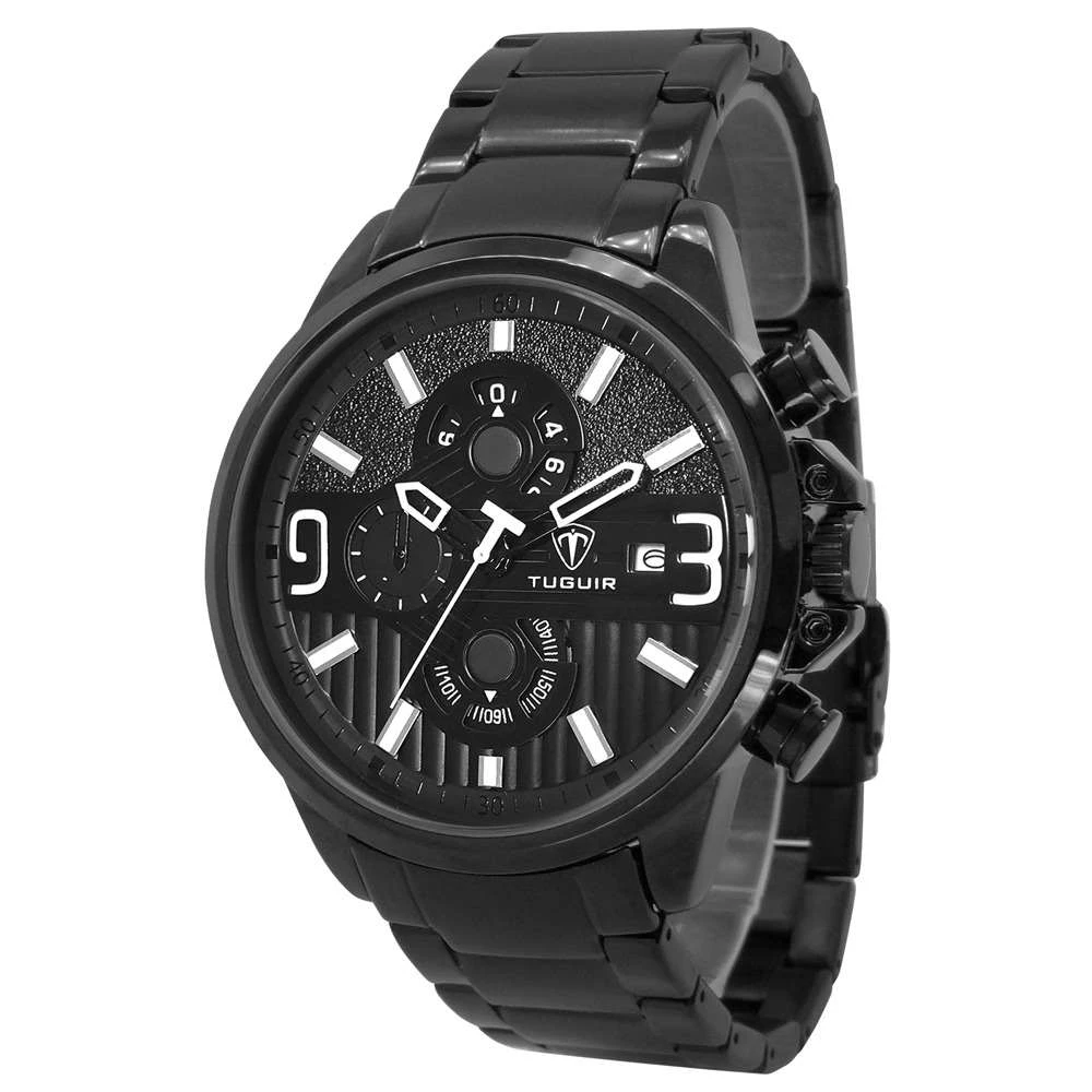 Funções: Analógico, Cronógrafo, Calendário, Horário em 24hResistência à Água: 50mDiâmetro da Caixa: 46 mmCaracterísticas: com caixa em Metal e pulseira em AçoVidro: Cristal MineralFundo RosqueadoAlimentação do maquinário: BateriaMostrador Preto com NúmerosGarantia de 1 Ano