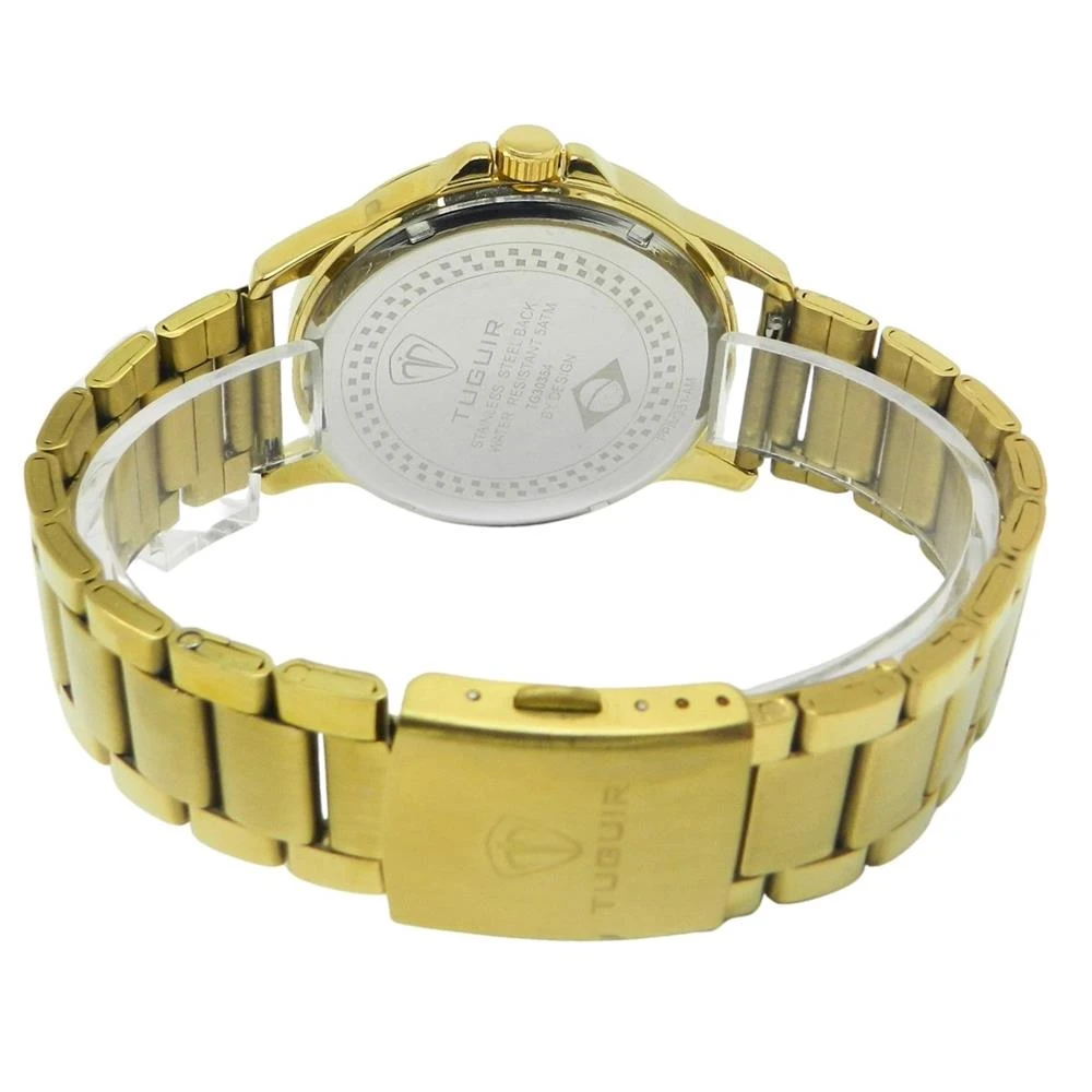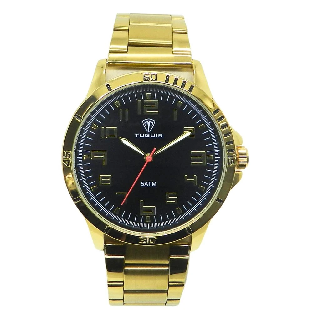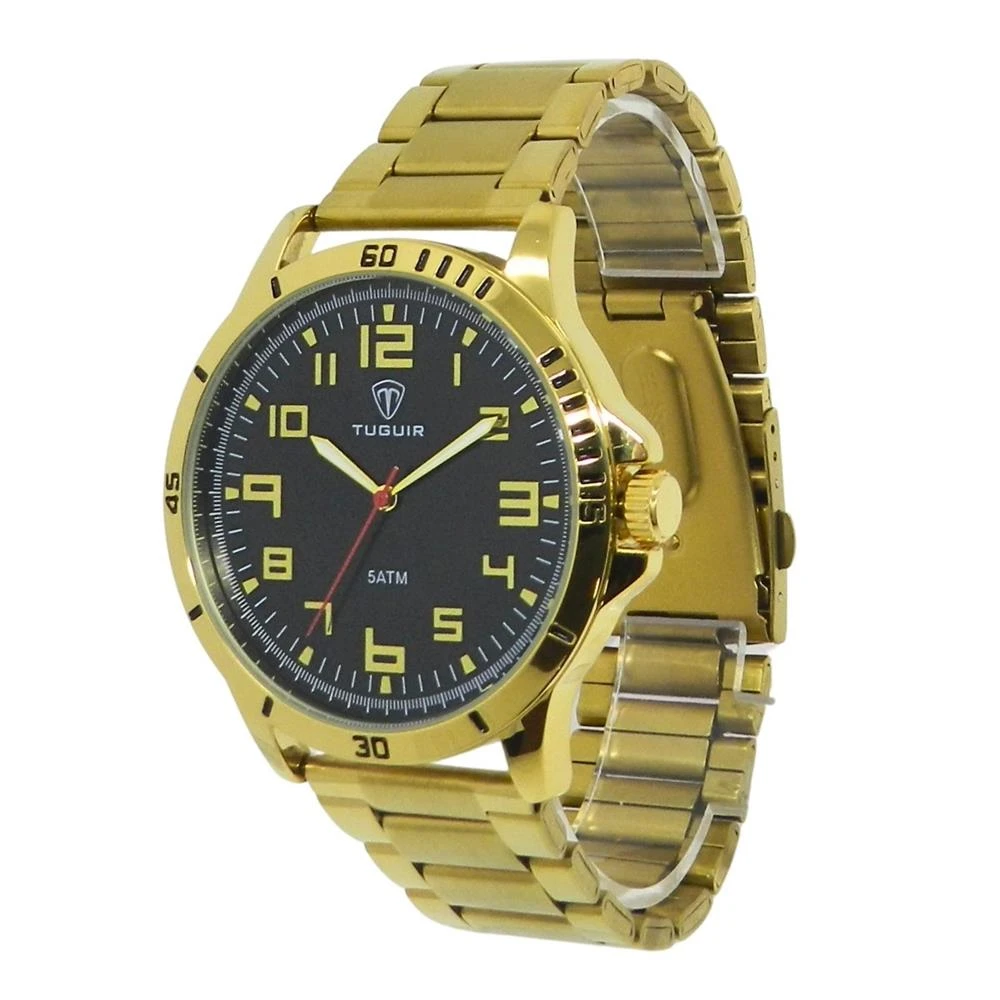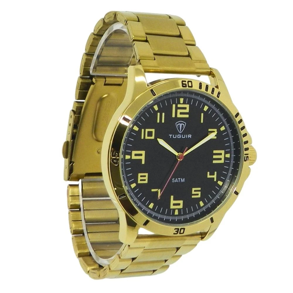 Funções: AnalógicoResistência à Água: 50mDiâmetro da Caixa: 44 mmCaracterísticas: com caixa em Metal e pulseira em AçoVidro: Cristal MineralFundo RosqueadoAlimentação do maquinário: BateriaMostrador Preto com todos os númerosAro Fixo DouradoGarantia de 1 Ano