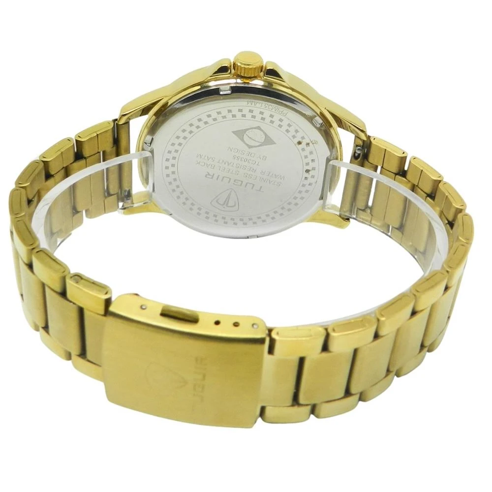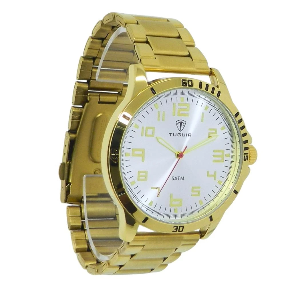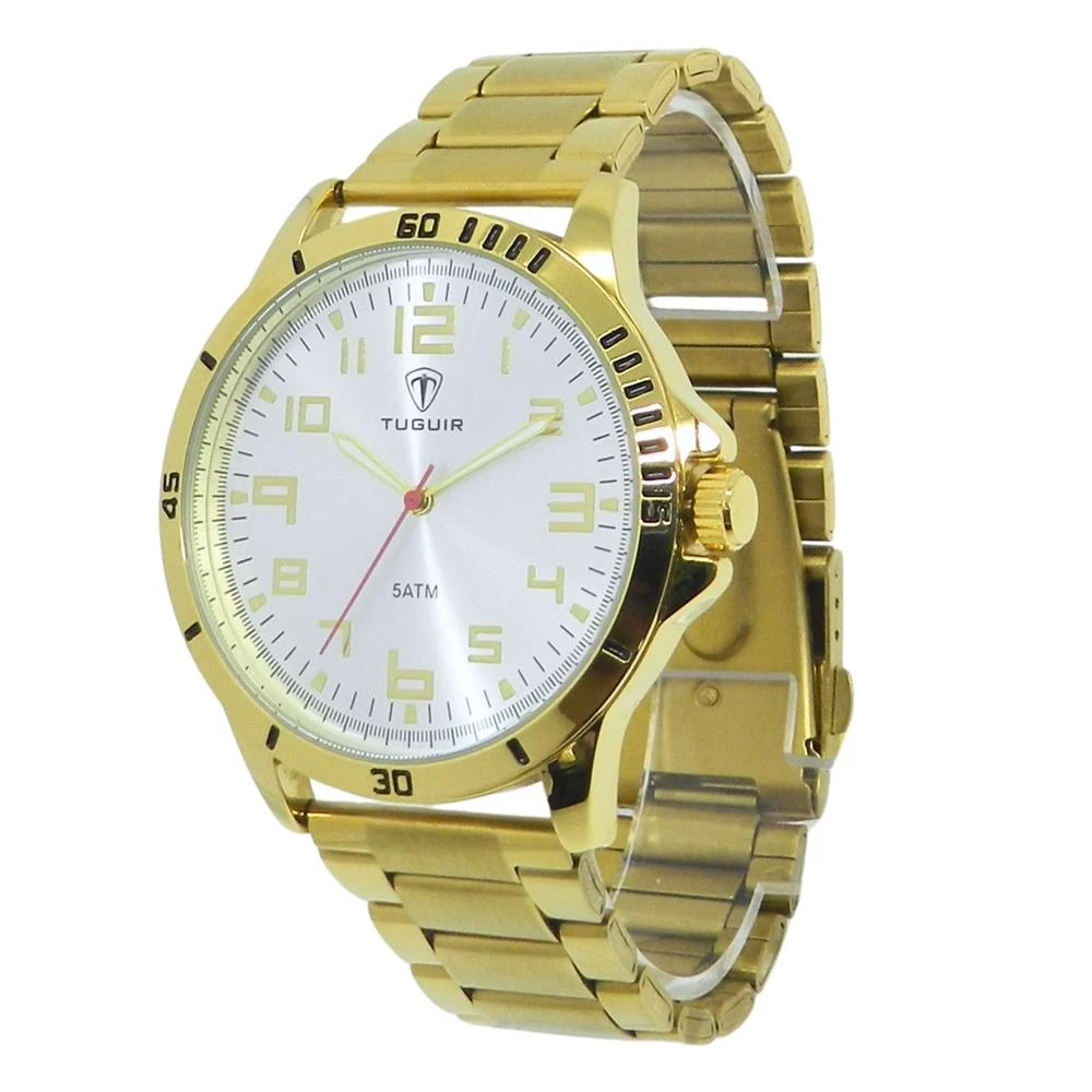 Funções: AnalógicoResistência à Água: 50mDiâmetro da Caixa: 44 mmCaracterísticas: com caixa em Metal e pulseira em AçoVidro: Cristal MineralFundo RosqueadoAlimentação do maquinário: BateriaMostrador Prateado com todos os númerosAro Fixo DouradoGarantia de 1 Ano