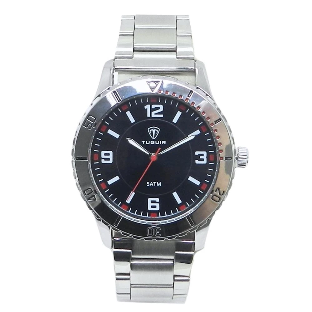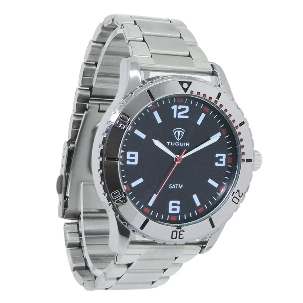 Funções: AnalógicoResistência à Água: 50mDiâmetro da Caixa: 44 mmCaracterísticas: com caixa em Metal e pulseira em AçoVidro: Cristal MineralFundo RosqueadoAlimentação do maquinário: BateriaMostrador Preto com números e detalhes em vermelhoAro Fixo Prateado com detalhes em vermelhoGarantia de 1 Ano