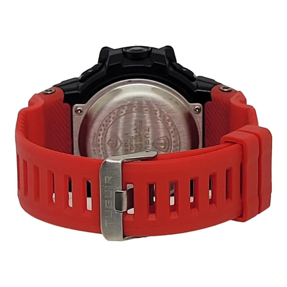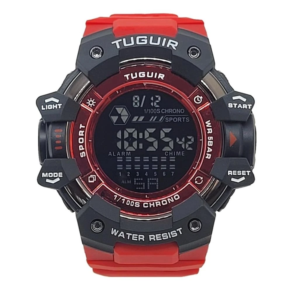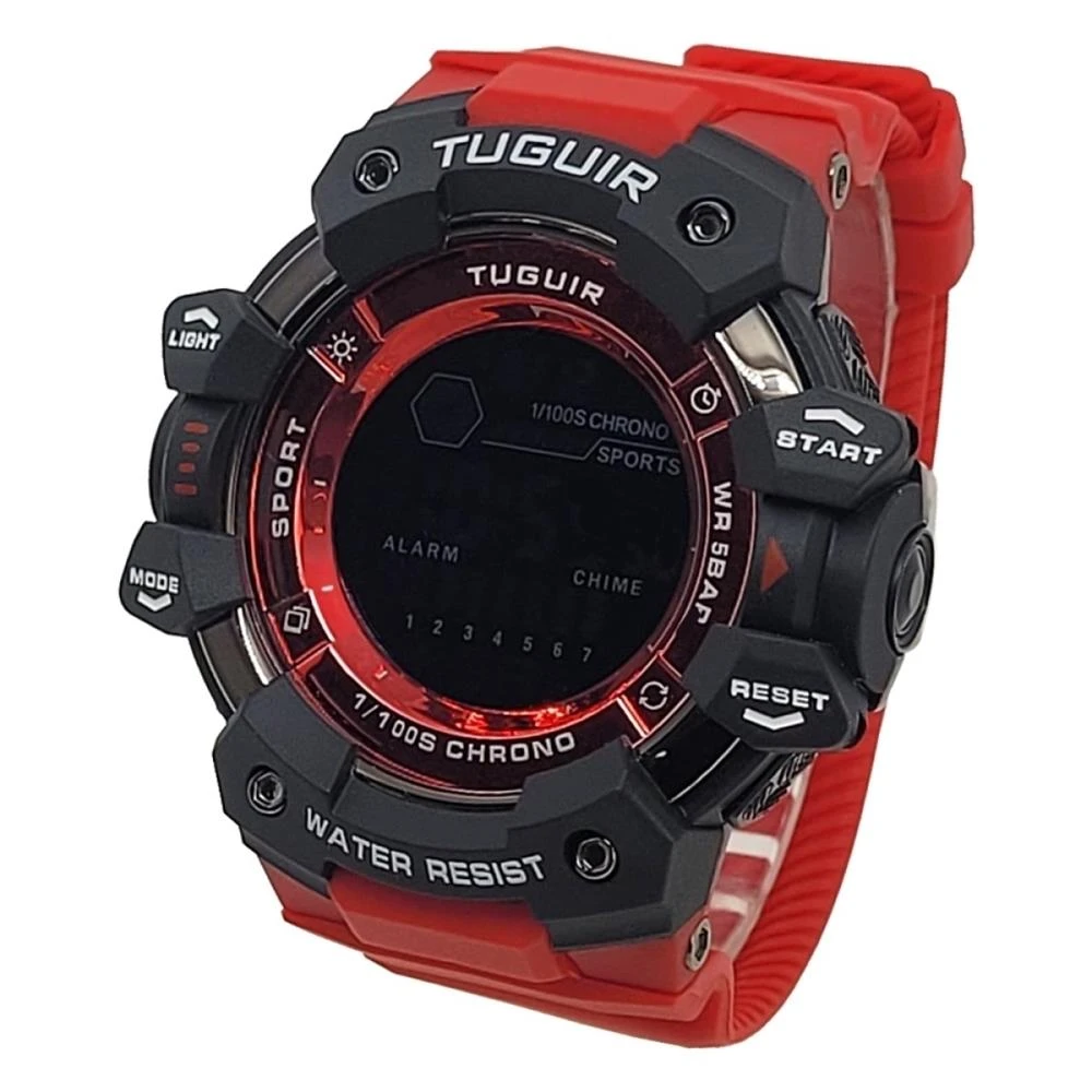 Funções: Digital, Calendário, Iluminação, Alarme, CronógrafoResistência à Água: 50mDiâmetro da Caixa: 56 mmCaracterísticas: com caixa em Policarbonato Preta e pulseira em Poliuretano VermelhaVidro: AcrílicoFundo ParafusadoAlimentação do maquinário: BateriaMostrador Vermelho com Detalhes em brancoGarantia de 1 Ano