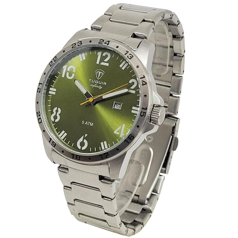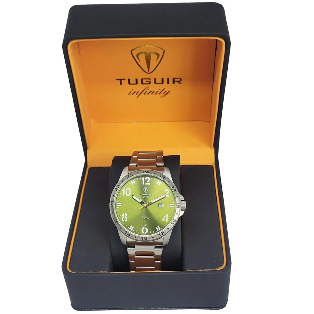 Funções: Analógico, CalendárioResistência à Água: 50mDiâmetro da Caixa: 43 mmCaracterísticas: com caixa em Aço e pulseira em AçoVidro: Cristal MineralFundo RosqueadoAlimentação do maquinário: BateriaMostrador Verde Oliva com númerosAro Fixo PrateadoLinha: Tuguir InfinityGarantia de 1 Ano