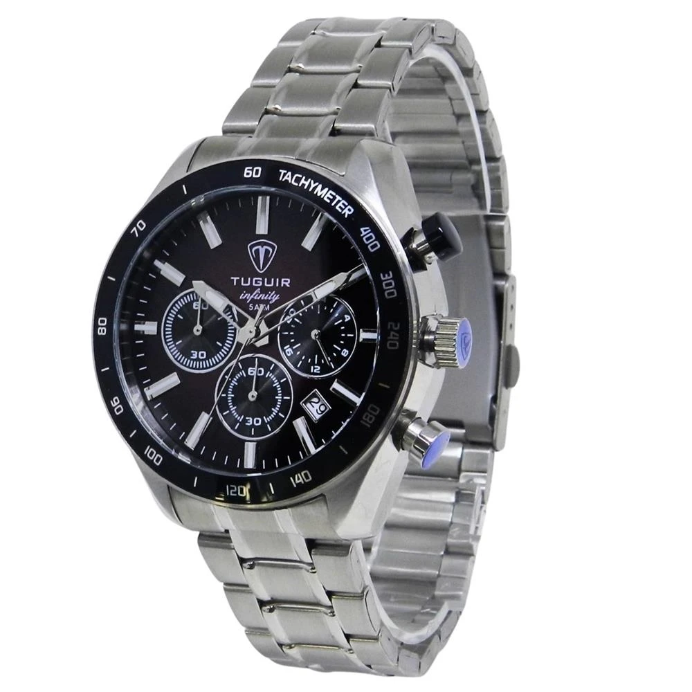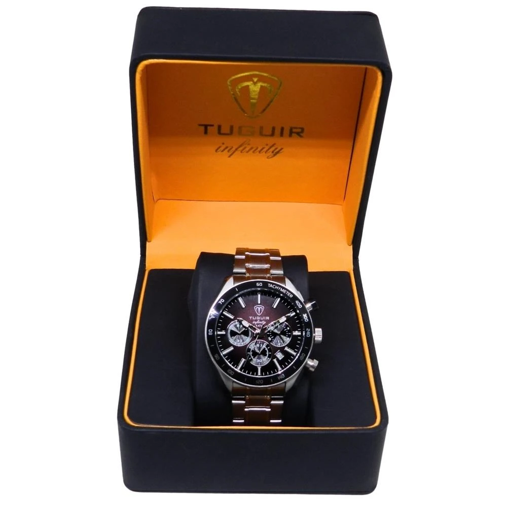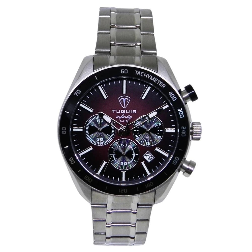 Funções: Analógico, Cronógrafo, CalendárioResistência à Água: 50mDiâmetro da Caixa: 42 mmCaracterísticas: com caixa em Aço e pulseira em AçoVidro: Cristal MineralFundo RosqueadoAlimentação do maquinário: BateriaMostrador Bordô DegradêAro Externo Fixo Preto com taquímetroLinha: Tuguir InfinityGarantia de 1 Ano