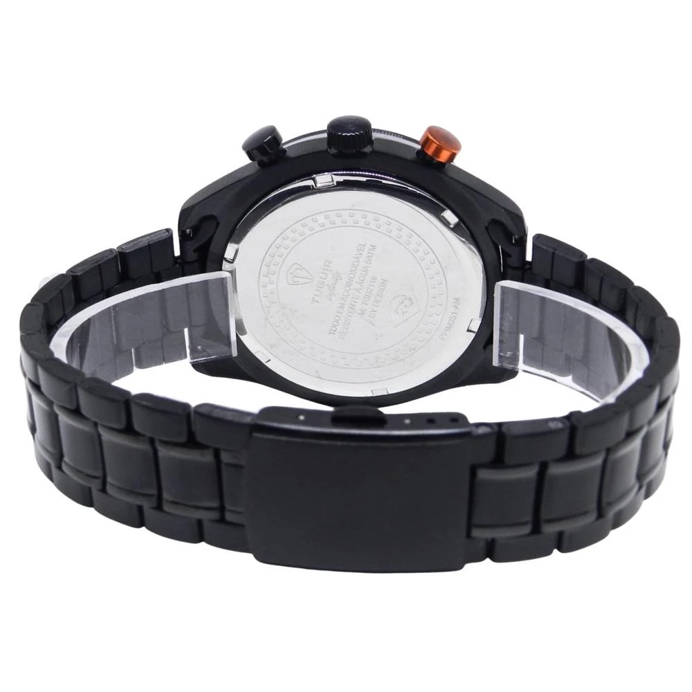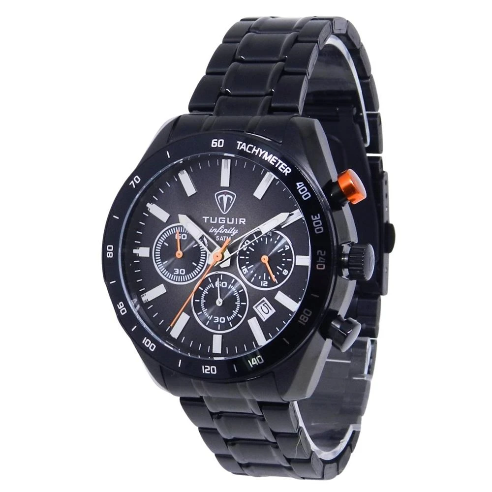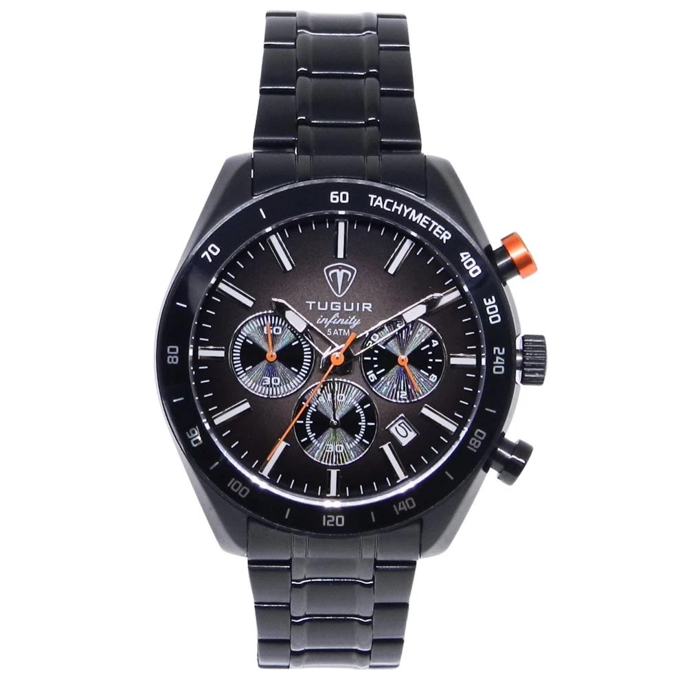 Funções: Analógico, Cronógrafo, CalendárioResistência à Água: 50mDiâmetro da Caixa: 42 mmCaracterísticas: com caixa em Aço e pulseira em AçoVidro: Cristal MineralFundo RosqueadoAlimentação do maquinário: BateriaMostrador grafite DegradêAro Externo Fixo Preto com taquímetroLinha: Tuguir InfinityGarantia de 1 Ano