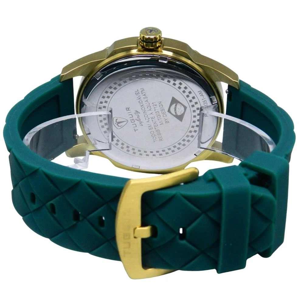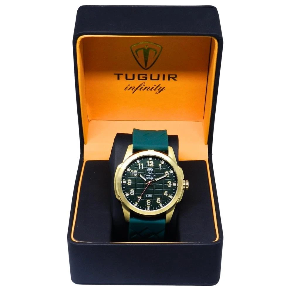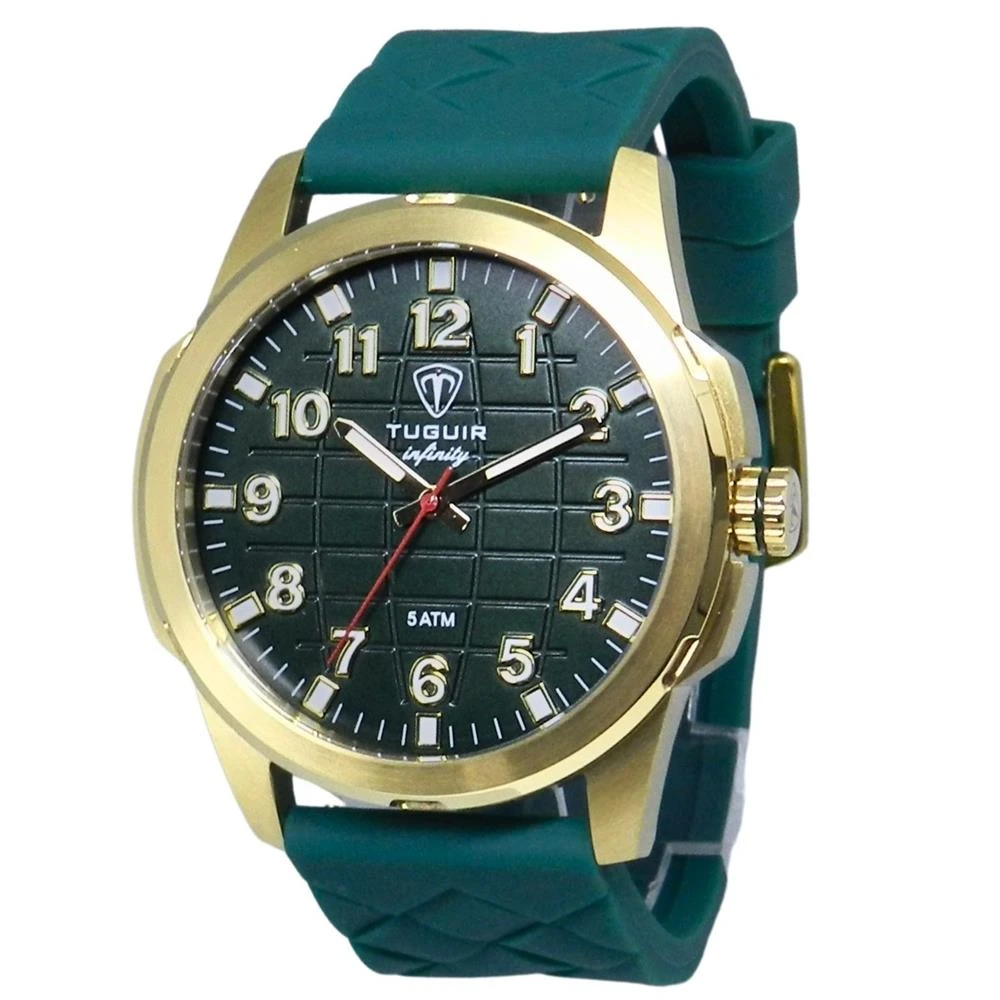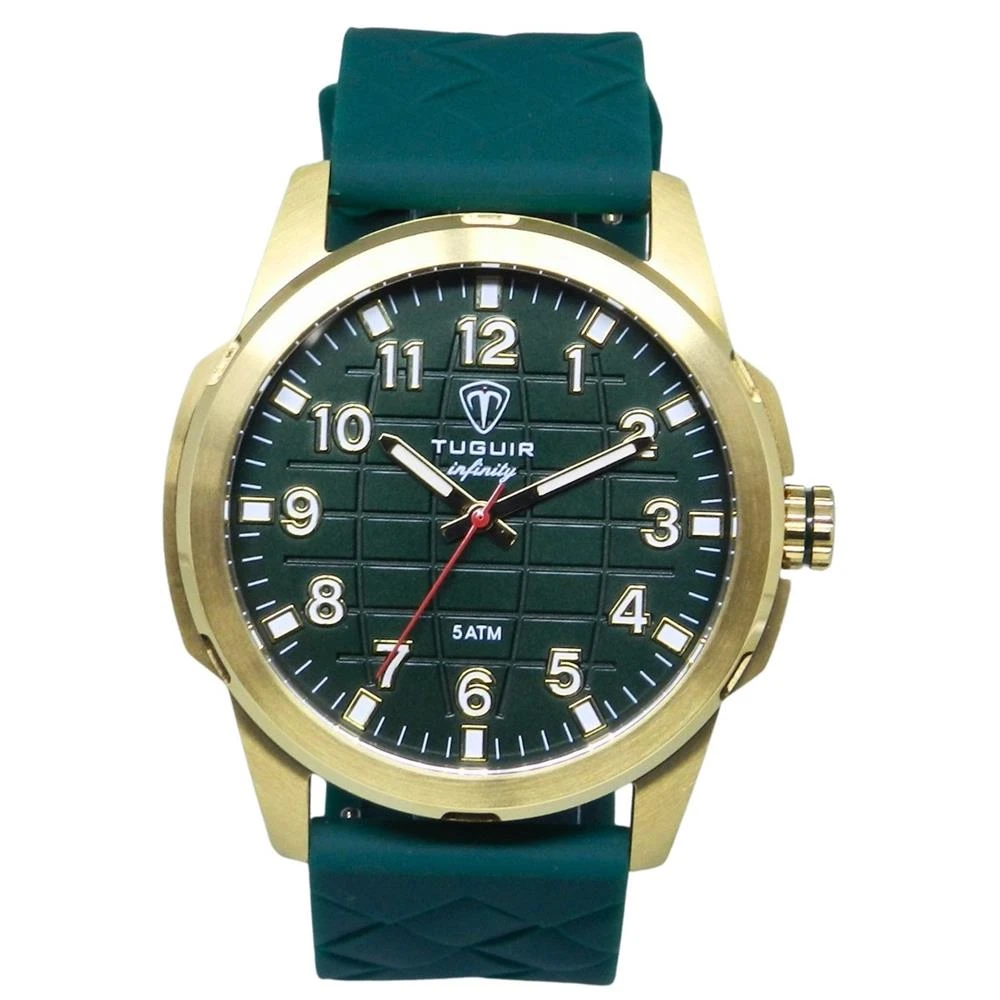 Funções: AnalógicoResistência à Água: 50mDiâmetro da Caixa: 46 mmCaracterísticas: com caixa em Aço e pulseira em Silicone VerdeVidro: Cristal MineralFundo RosqueadoAlimentação do maquinário: BateriaMostrador Verde com Todos os NúmerosLinha: Tuguir InfinityGarantia de 1 Ano