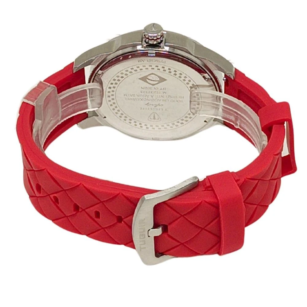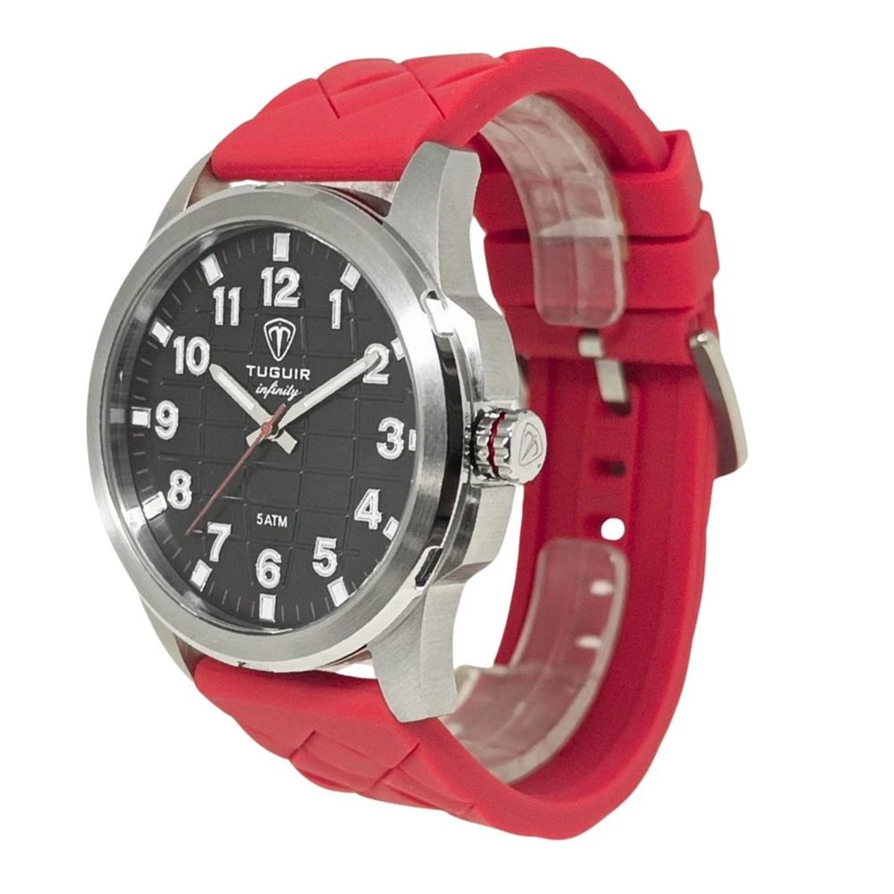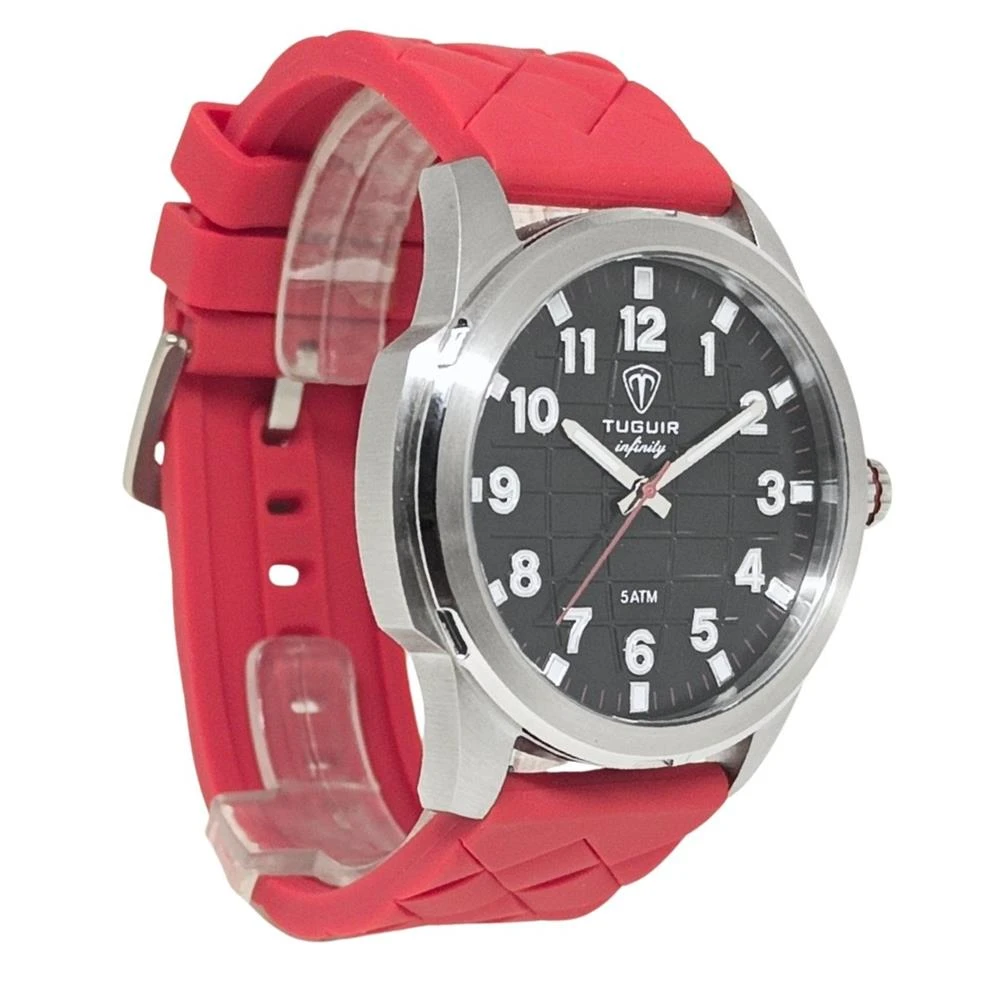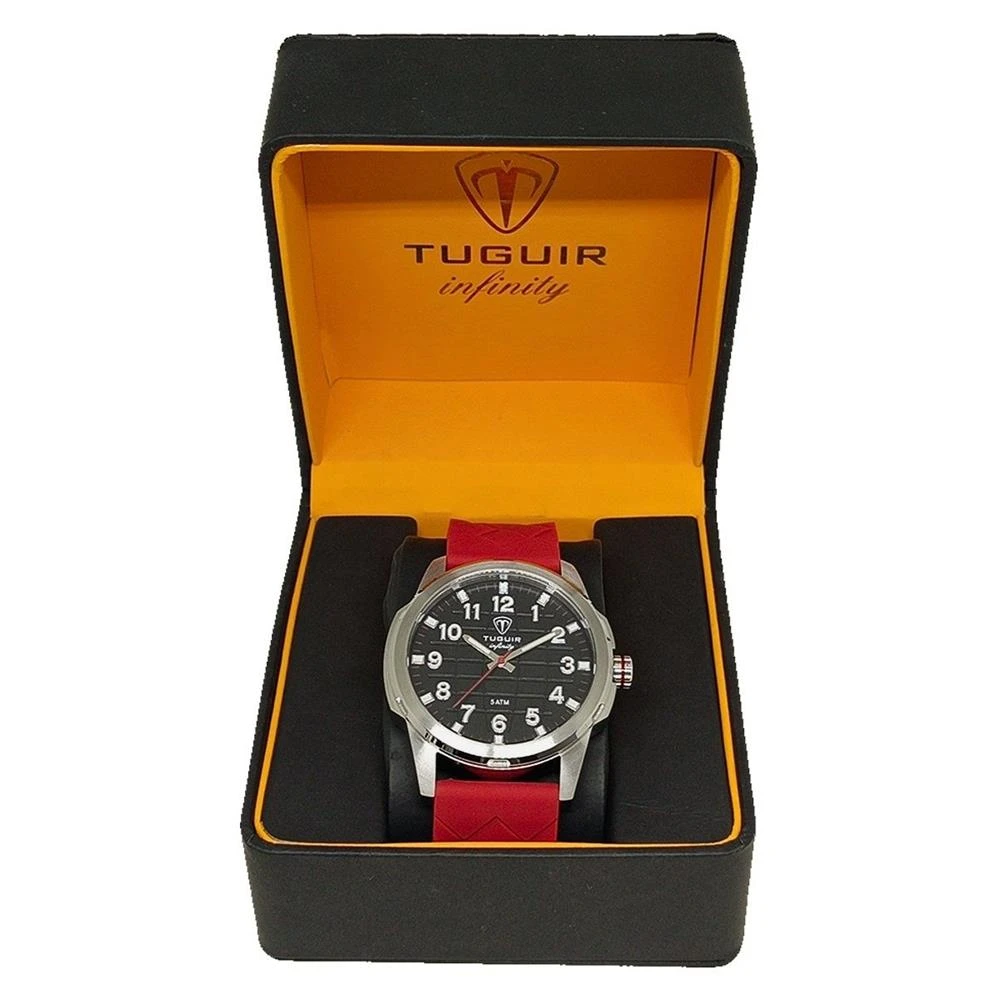 Funções: AnalógicoResistência à Água: 50mDiâmetro da Caixa: 46 mmCaracterísticas: com caixa em Aço e pulseira em Silicone VermelhoVidro: Cristal MineralFundo RosqueadoAlimentação do maquinário: BateriaMostrador Preto com Todos os NúmerosLinha: Tuguir InfinityGarantia de 1 Ano