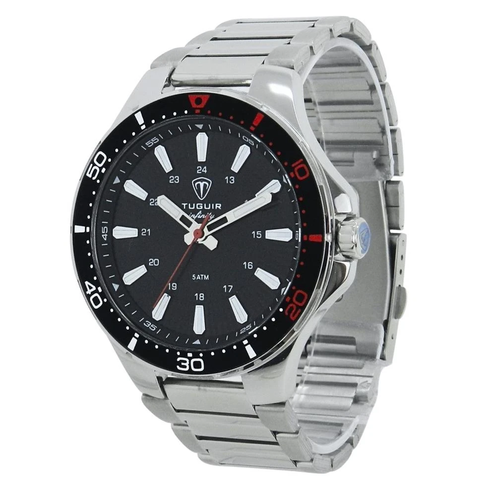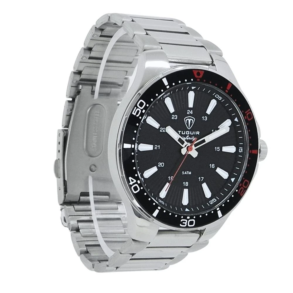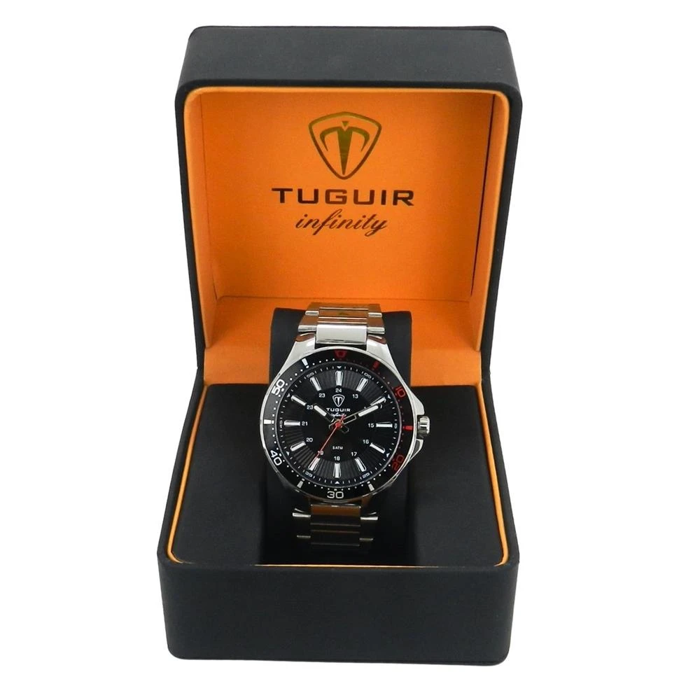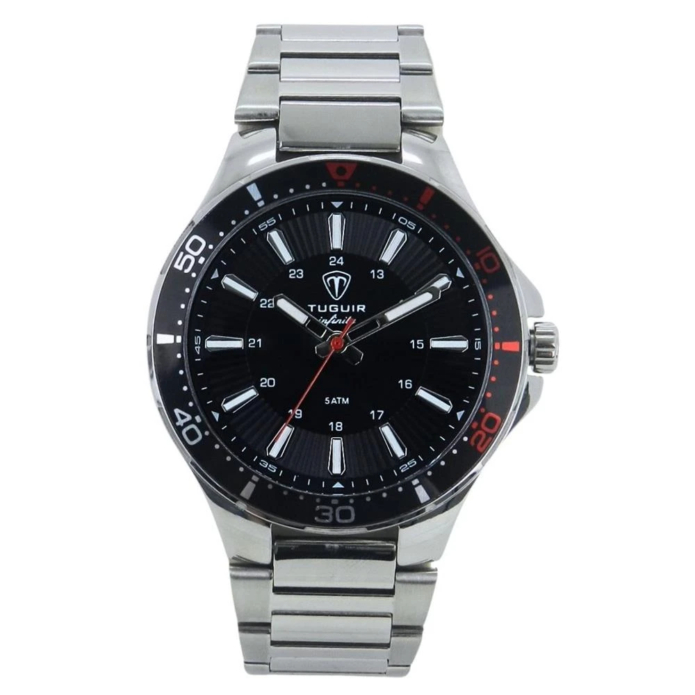 Funções: AnalógicoResistência à Água: 50mDiâmetro da Caixa: 46 mmCaracterísticas: com caixa em Aço e pulseira em AçoVidro: Cristal MineralFundo RosqueadoAlimentação do maquinário: BateriaMostrador PretoAro Fixo Preto com detalhes em vermelhoLinha: Tuguir InfinityGarantia de 1 Ano
