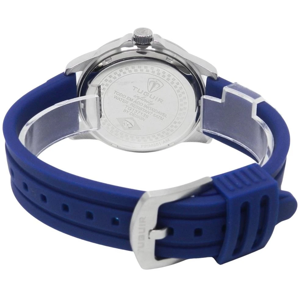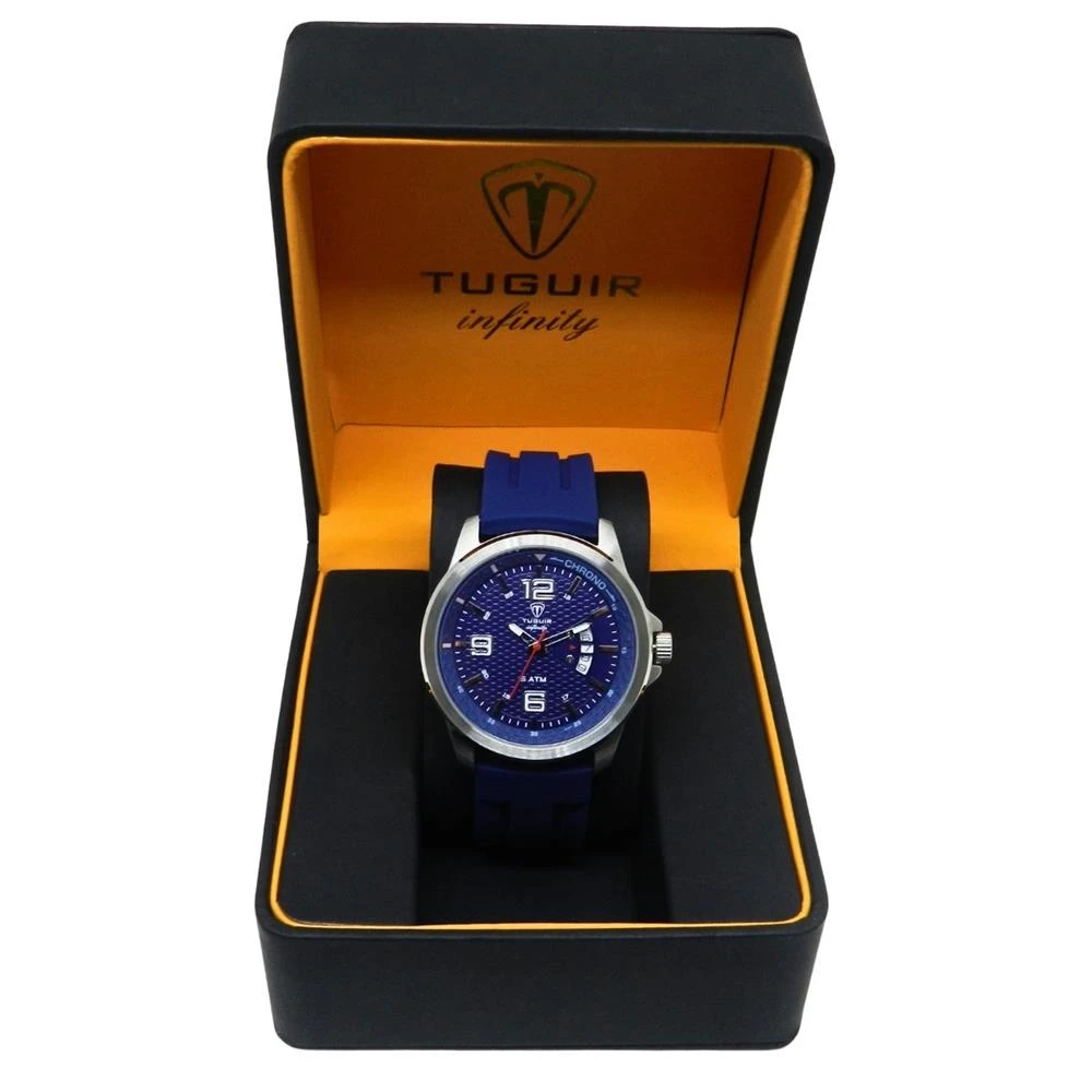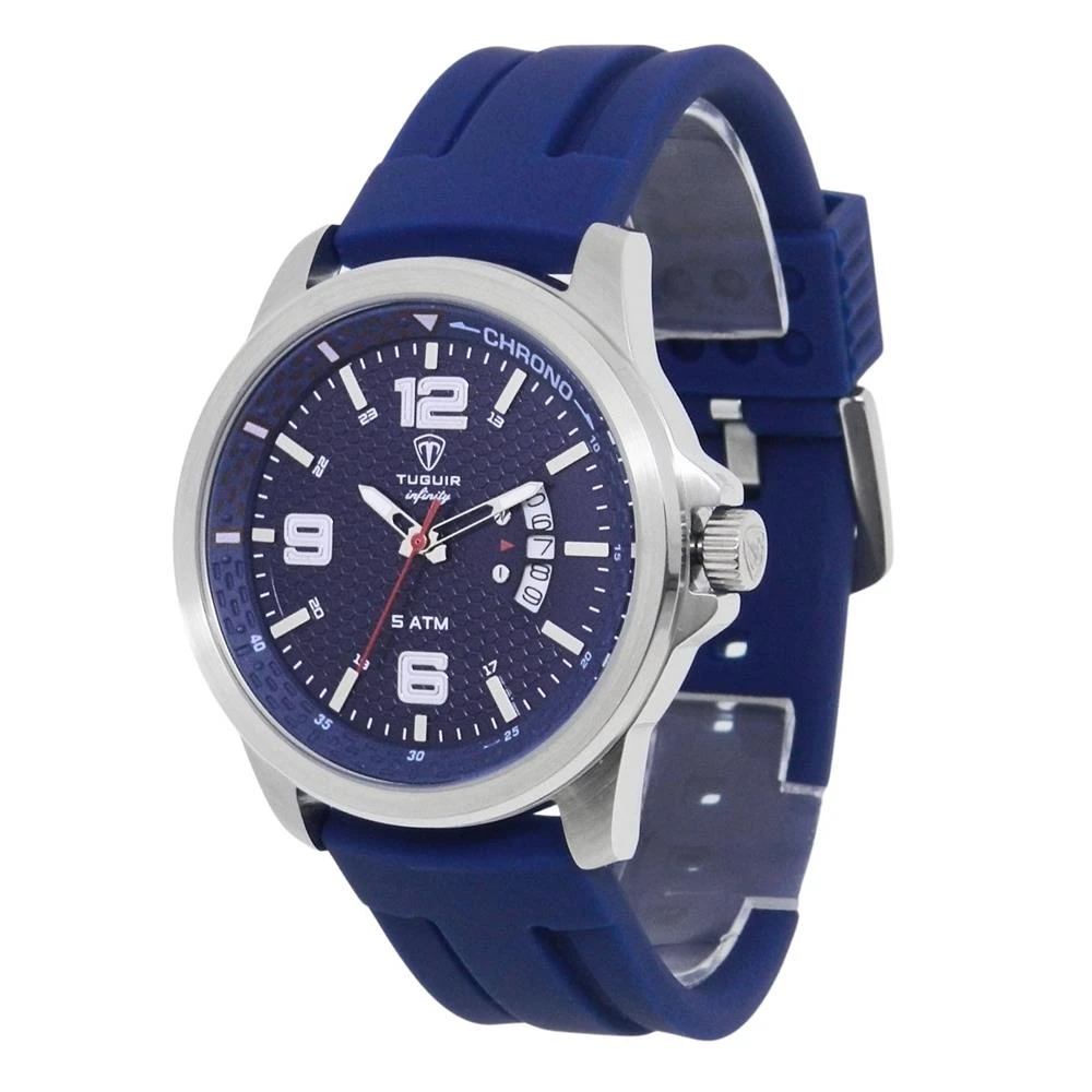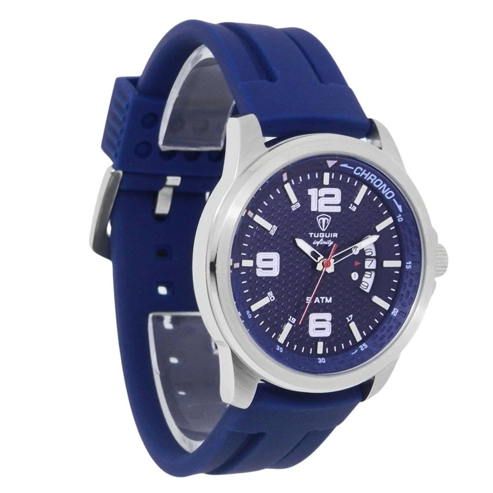 Funções: Analógico, CalendárioResistência à Água: 50mDiâmetro da Caixa: 43 mmCaracterísticas: com caixa em Aço e pulseira em Silicone AzulVidro: Cristal MineralFundo RosqueadoAlimentação do maquinário: BateriaMostrador Azul com NúmerosLinha: Tuguir InfinityGarantia de 1 Ano