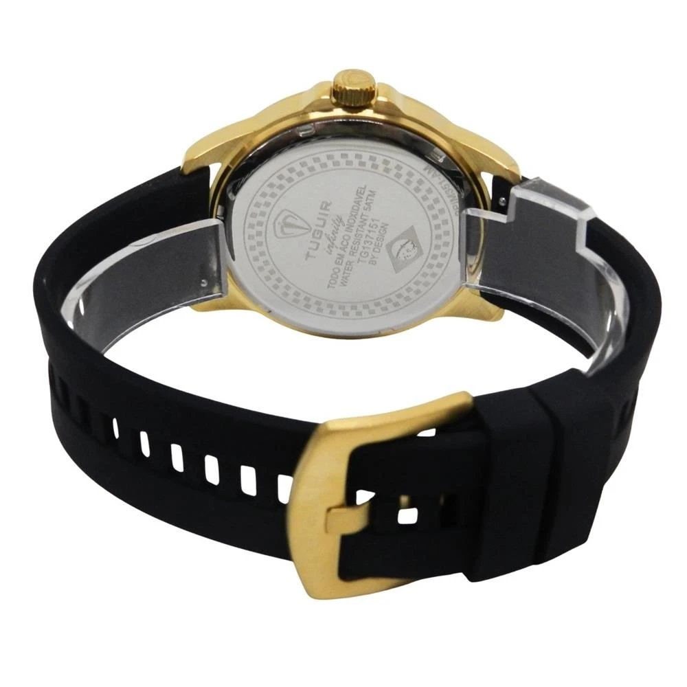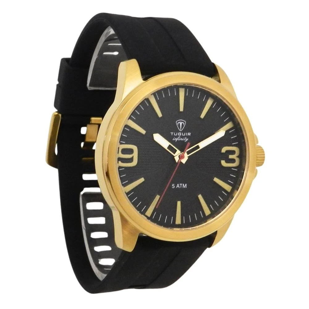 Funções: AnalógicoResistência à Água: 50mDiâmetro da Caixa: 43 mmCaracterísticas: com caixa em Aço e pulseira em Silicone PretoVidro: Cristal MineralFundo RosqueadoAlimentação do maquinário: BateriaMostrador Preto com NúmerosLinha: Tuguir InfinityGarantia de 1 Ano