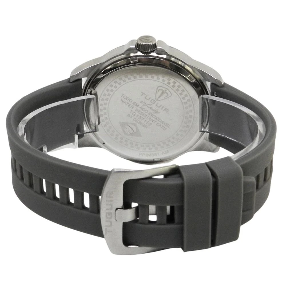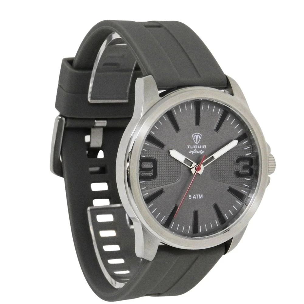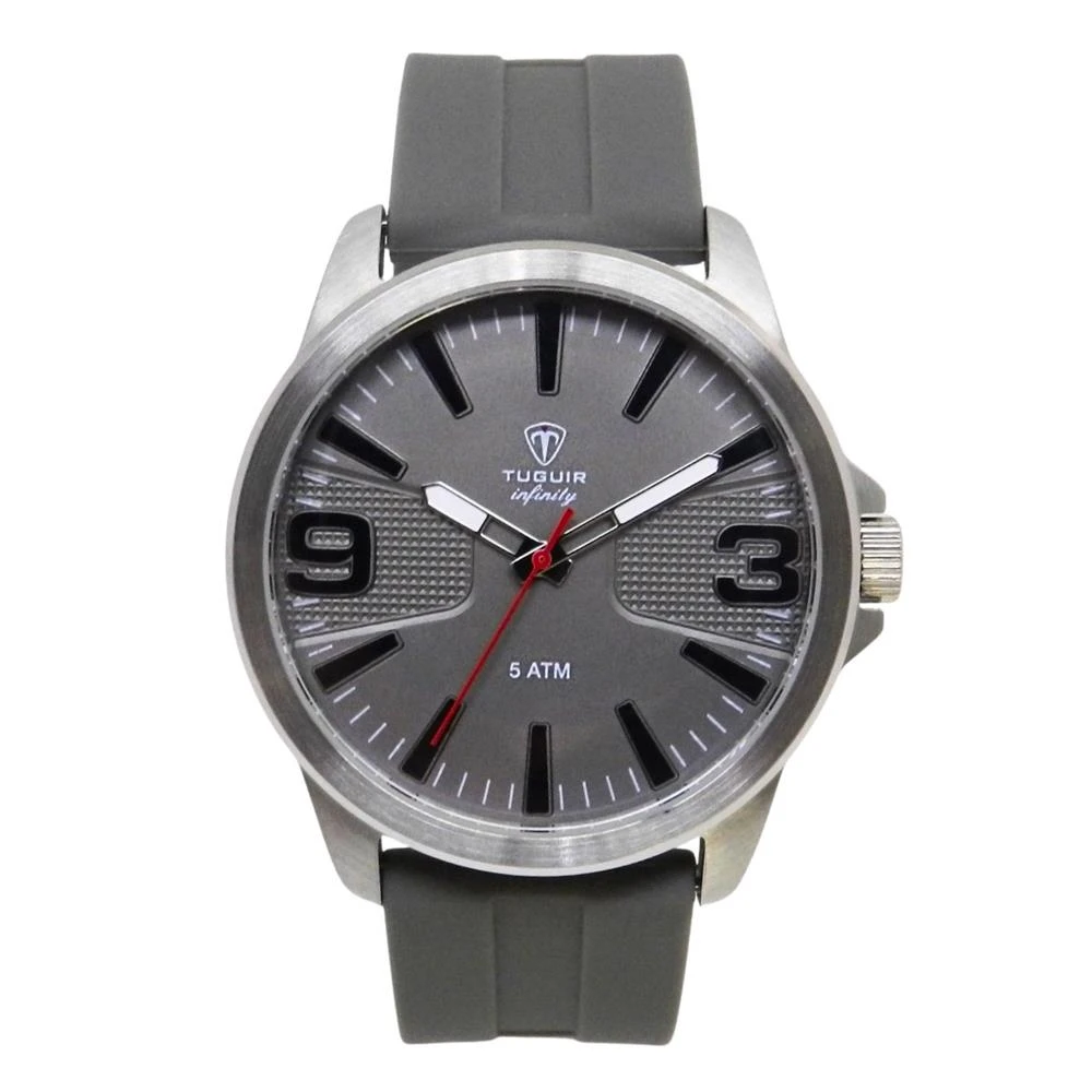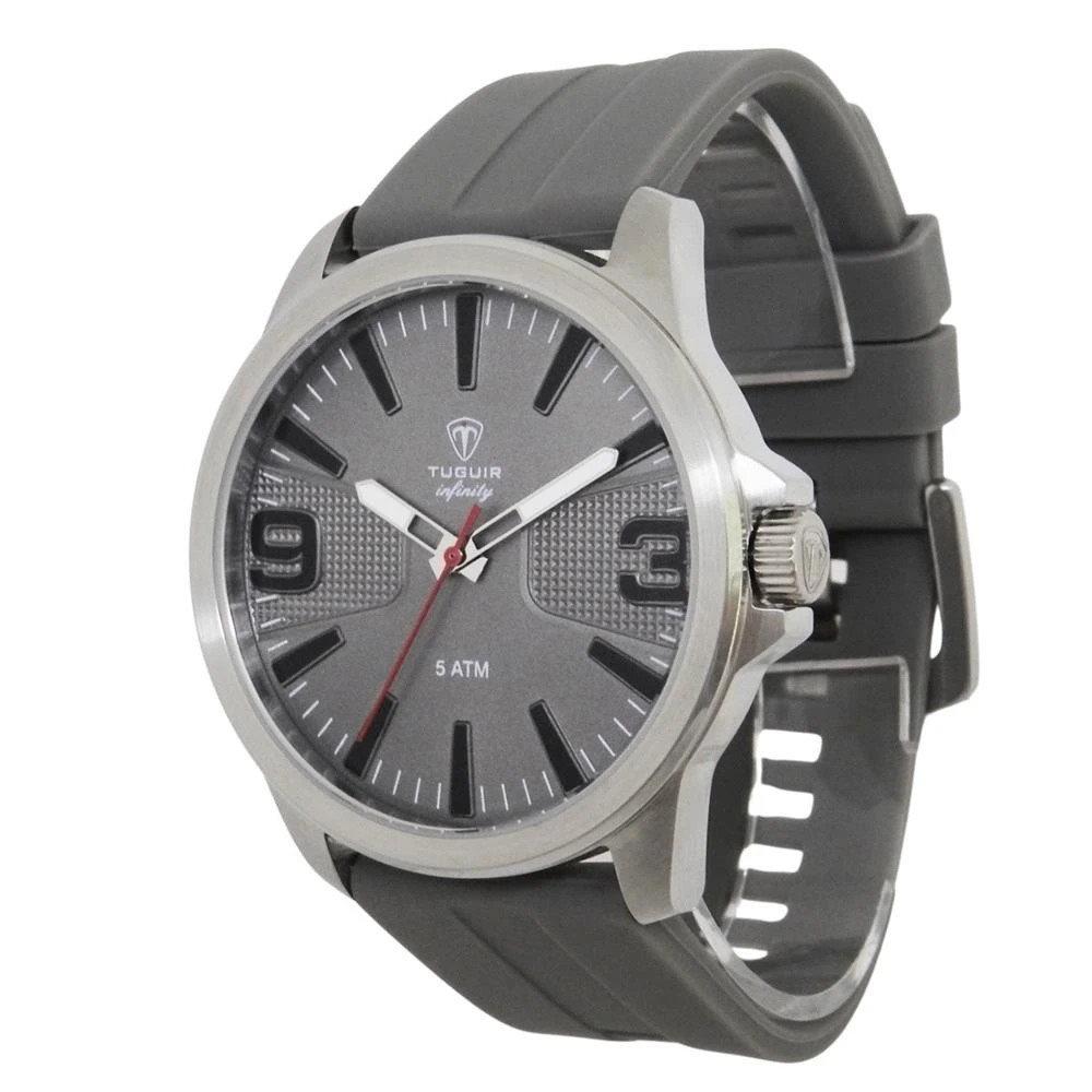 Funções: AnalógicoResistência à Água: 50mDiâmetro da Caixa: 43 mmCaracterísticas: com caixa em Aço e pulseira em Silicone CinzaVidro: Cristal MineralFundo RosqueadoAlimentação do maquinário: BateriaMostrador Cinza com NúmerosLinha: Tuguir InfinityGarantia de 1 Ano