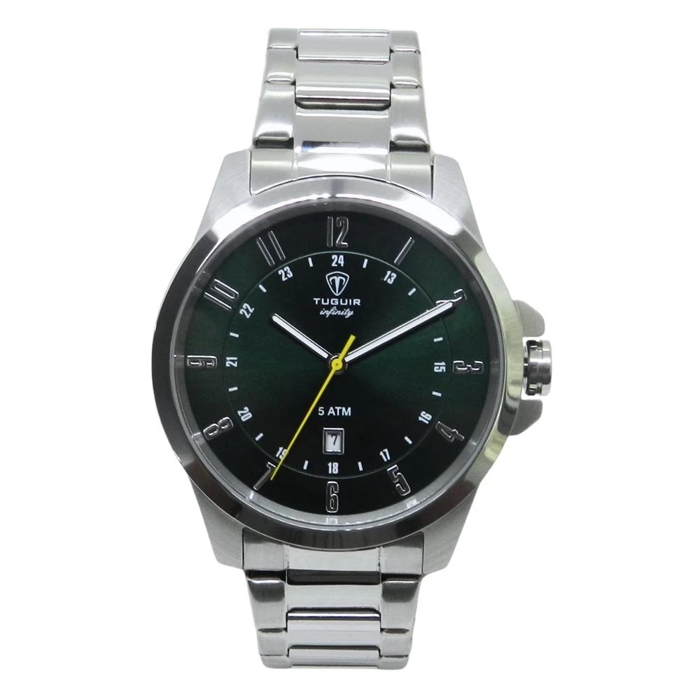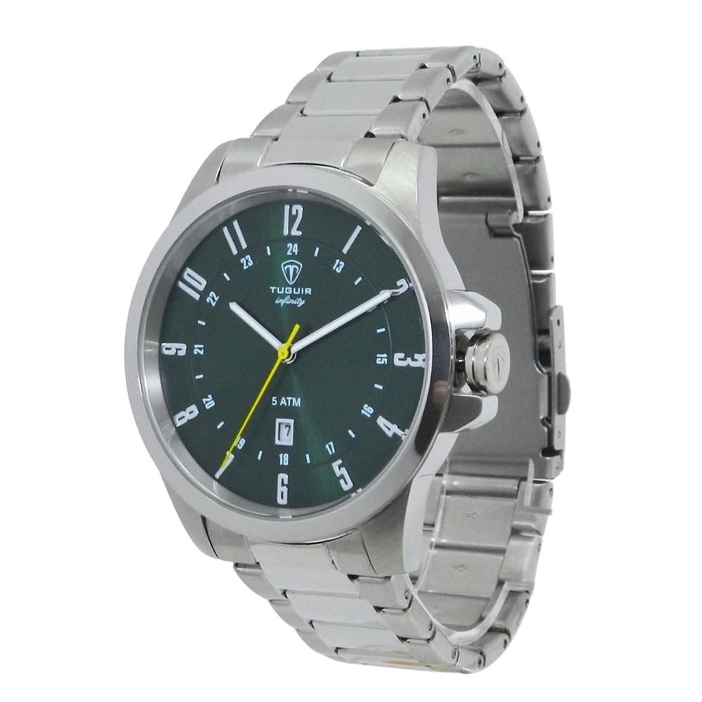 Funções: Analógico, CalendárioResistência à Água: 50mDiâmetro da Caixa: 45 mmCaracterísticas: com caixa em Aço e pulseira em AçoVidro: Cristal MineralFundo RosqueadoAlimentação do maquinário: BateriaMostrador verde com todos os númerosLinha: Tuguir InfinityGarantia de 1 Ano