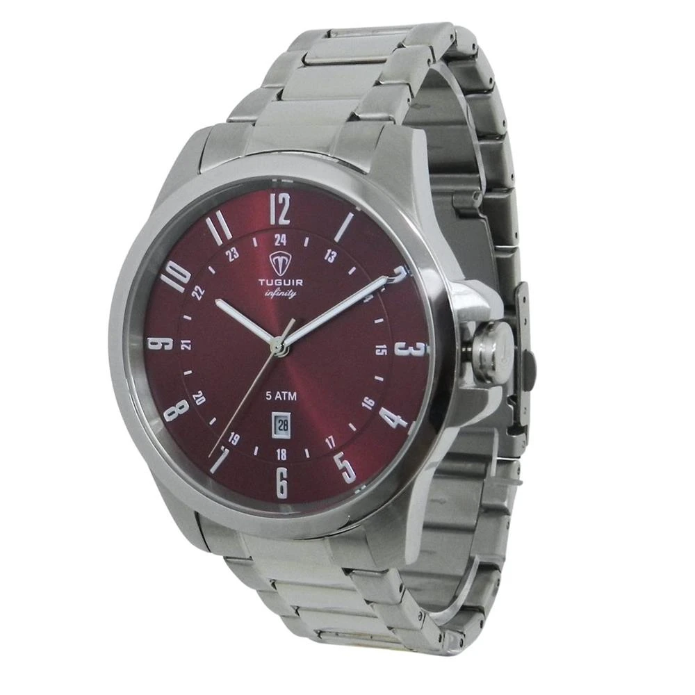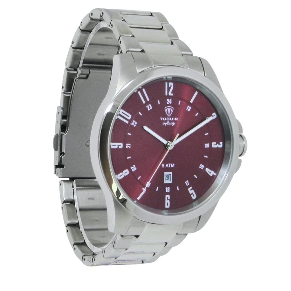 Funções: Analógico, CalendárioResistência à Água: 50mDiâmetro da Caixa: 45 mmCaracterísticas: com caixa em Aço e pulseira em AçoVidro: Cristal MineralFundo RosqueadoAlimentação do maquinário: BateriaMostrador bordô com todos os númerosLinha: Tuguir InfinityGarantia de 1 Ano
