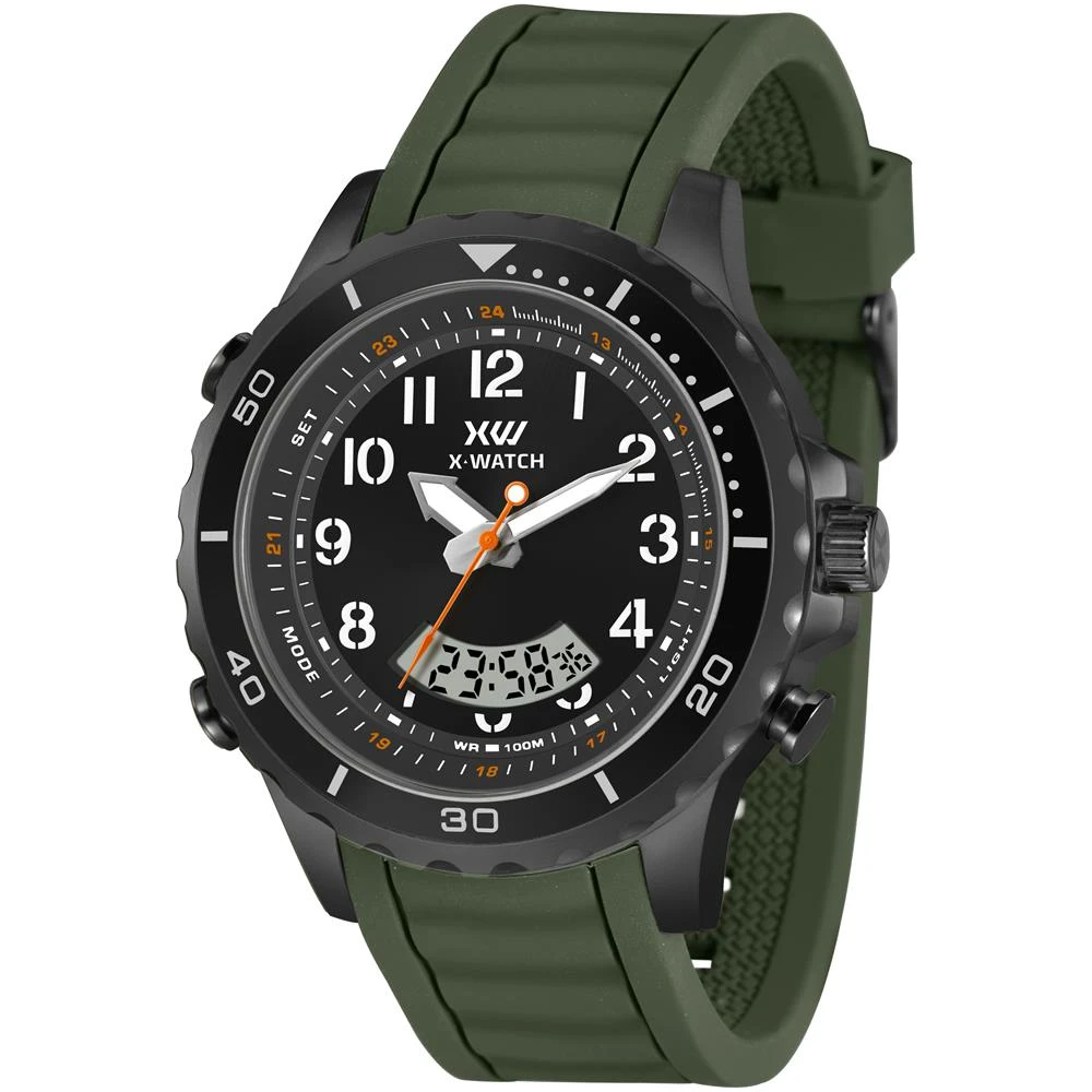Visor: LCDFunções: Anadigi, Calendário, Iluminação, Alarme, Cronógrafo, Dual TimeResistência à Água: 100mDiâmetro da Caixa: 50 mmCaracterísticas: com caixa em Aço e pulseira em Silicone VerdeVidro: Cristal MineralFundo RosqueadoAlimentação do maquinário: BateriaMostrador Preto com todos os Números e detalhes em branco e laranjaAro fixo pretoGarantia de 1 Ano