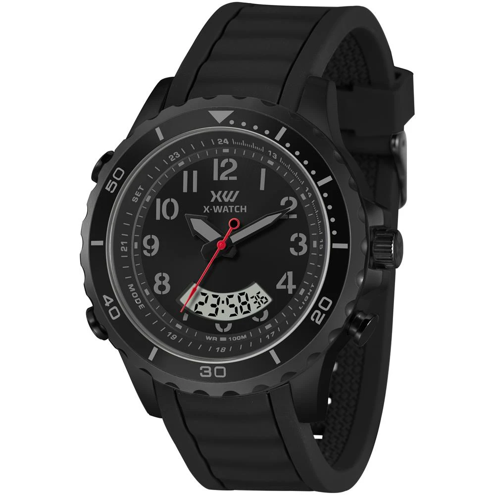 Visor: LCDFunções: Anadigi, Calendário, Iluminação, Alarme, Cronógrafo, Dual TimeResistência à Água: 100mDiâmetro da Caixa: 50 mmCaracterísticas: com caixa em Aço e pulseira em Silicone PretaVidro: Cristal MineralFundo RosqueadoAlimentação do maquinário: BateriaMostrador Preto com todos os Números e detalhes em cinza e vermelhoAro fixo pretoGarantia de 1 Ano