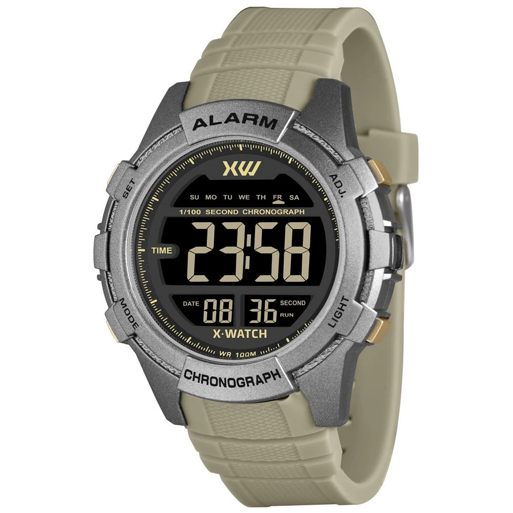 Funções: Digital, Iluminação, Calendário, Cronógrafo, Alarme, Timer, Dual TimeResistência à Água: 100mDiâmetro da Caixa: 50 mmCaracterísticas: com caixa em Resina prateada e pulseira em Silicone CáquiVidro: AcrílicoFundo ParafusadoAlimentação do maquinário: BateriaMostrador Preto com detalhes em douradoGarantia de 1 Ano