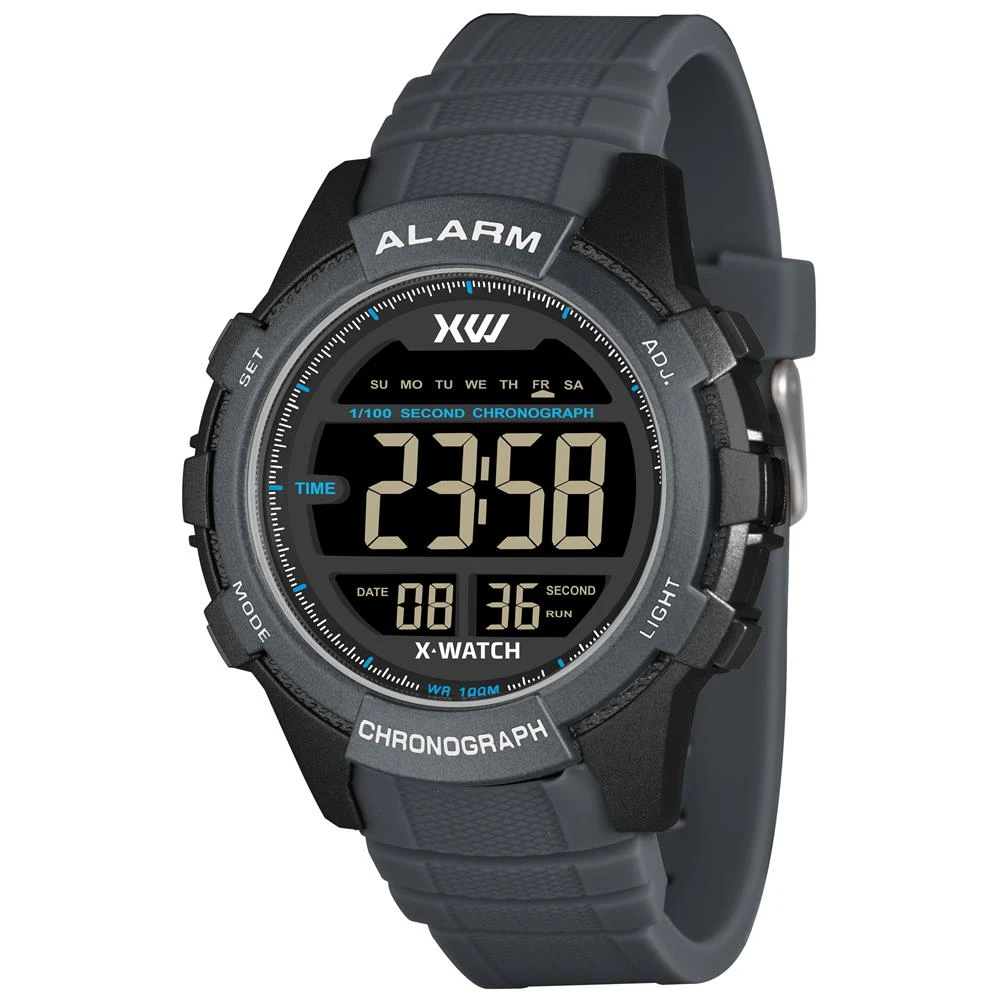 Funções: Digital, Iluminação, Calendário, Cronógrafo, Alarme, Timer, Dual TimeResistência à Água: 100mDiâmetro da Caixa: 50 mmCaracterísticas: com caixa em Resina preta com detalhe em Azul e pulseira em Silicone AzulVidro: AcrílicoFundo ParafusadoAlimentação do maquinário: BateriaMostrador Preto com detalhes em branco e azulGarantia de 1 Ano