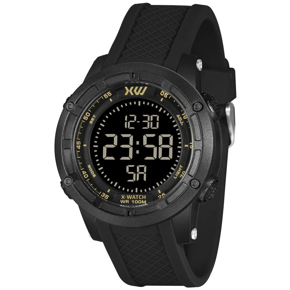 Funções: Digital, Iluminação, Calendário, Cronógrafo, Alarme, Timer, Dual TimeResistência à Água: 100mDiâmetro da Caixa: 50 mmCaracterísticas: com caixa em Resina Preta e pulseira em Silicone PretaVidro: AcrílicoFundo ParafusadoAlimentação do maquinário: BateriaMostrador Preto com detalhes em douradoGarantia de 1 Ano