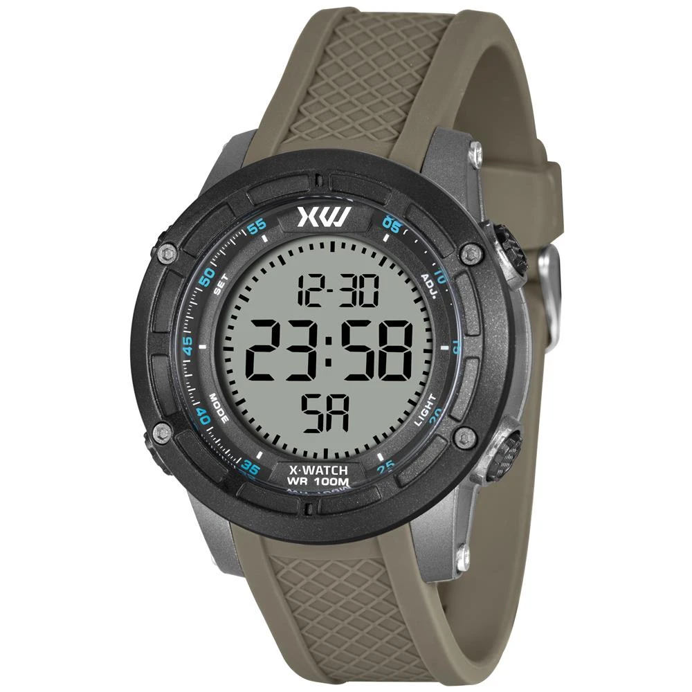 Funções: Digital, Iluminação, Calendário, Cronógrafo, Alarme, Timer, Dual TimeResistência à Água: 100mDiâmetro da Caixa: 50 mmCaracterísticas: com caixa em Resina cinza com detalhe em Preto e pulseira em Silicone MarromVidro: AcrílicoFundo ParafusadoAlimentação do maquinário: BateriaMostrador Preto com detalhes em branco e azulGarantia de 1 Ano