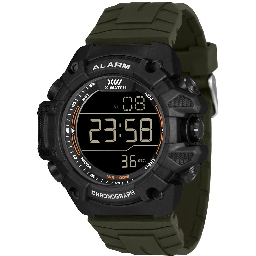 Funções: Digital, Iluminação, Calendário, Cronógrafo, Alarme, Timer, Dual TimeResistência à Água: 100mDiâmetro da Caixa: 54 mmCaracterísticas: com caixa em Resina Preta e pulseira em Silicone VerdeVidro: AcrílicoFundo ParafusadoAlimentação do maquinário: BateriaMostrador Preto com detalhes em branco e laranjaGarantia de 1 Ano