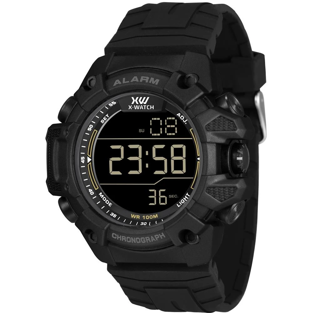 Funções: Digital, Iluminação, Calendário, Cronógrafo, Alarme, Timer, Dual TimeResistência à Água: 100mDiâmetro da Caixa: 54 mmCaracterísticas: com caixa em Resina Preta e pulseira em Silicone PretaVidro: AcrílicoFundo ParafusadoAlimentação do maquinário: BateriaMostrador Preto com detalhes em branco e douradoGarantia de 1 Ano
