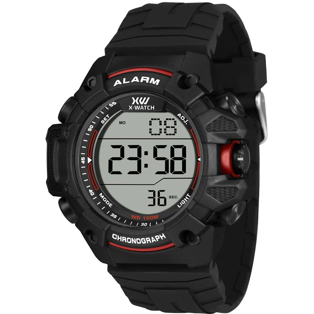 Funções: Digital, Iluminação, Calendário, Cronógrafo, Alarme, Timer, Dual TimeResistência à Água: 100mDiâmetro da Caixa: 54 mmCaracterísticas: com caixa em Resina Preta e pulseira em Silicone PretaVidro: AcrílicoFundo ParafusadoAlimentação do maquinário: BateriaMostrador Preto com detalhes em branco e vermelhoGarantia de 1 Ano