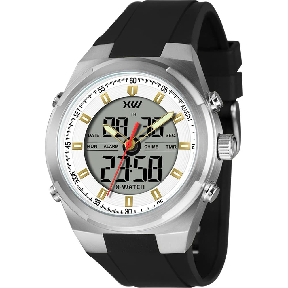 Visor: LCDFunções: Anadigi, Calendário, Iluminação, Alarme, Cronógrafo, TImer, Dual TimeResistência à Água: 100mDiâmetro da Caixa: 44 mmCaracterísticas: com caixa em Aço e pulseira em Silicone PretaVidro: Cristal MineralFundo RosqueadoAlimentação do maquinário: BateriaMostrador Branco com detalhes em dourado e vermelhoGarantia de 1 Ano