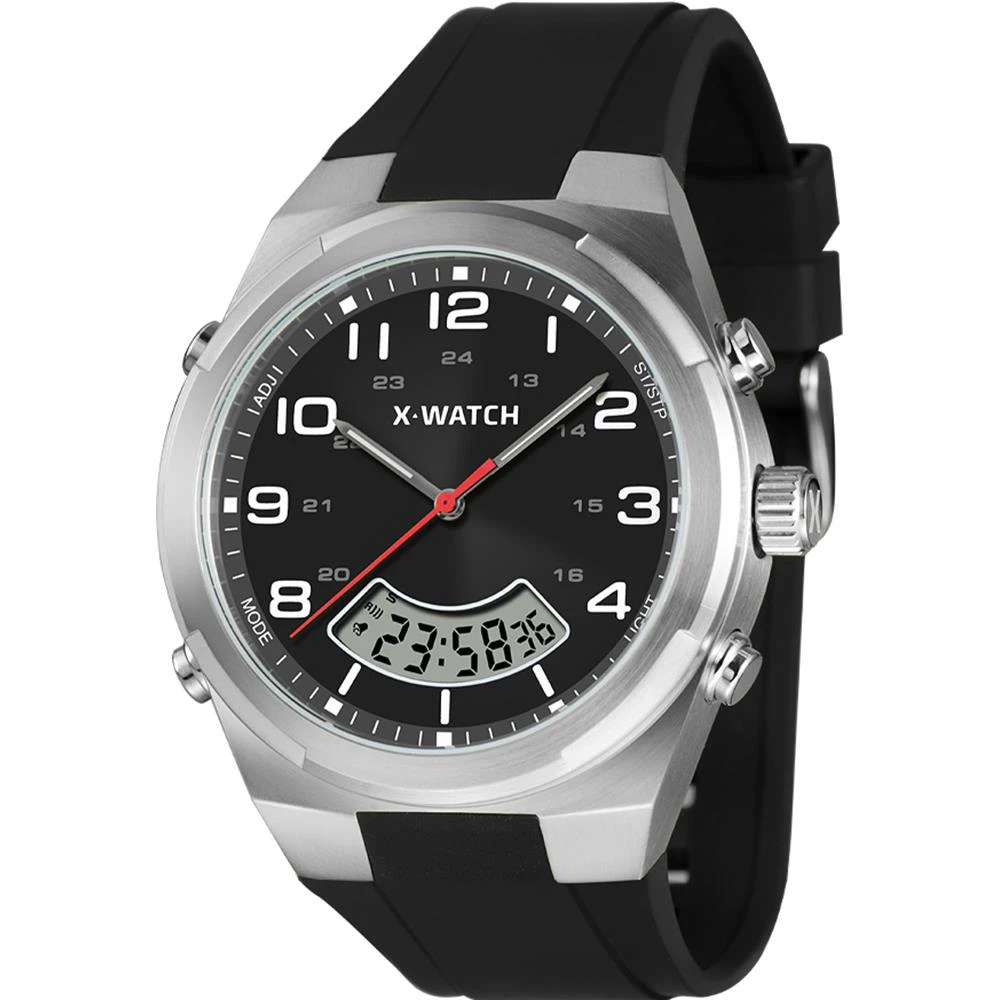 Visor: LCDFunções: Anadigi, Calendário, Iluminação, Alarme, CronógrafoResistência à Água: 100mDiâmetro da Caixa: 44 mmCaracterísticas: com caixa em Aço e pulseira em Silicone PretaVidro: Cristal MineralFundo RosqueadoAlimentação do maquinário: BateriaMostrador Preto com númerosGarantia de 1 Ano
