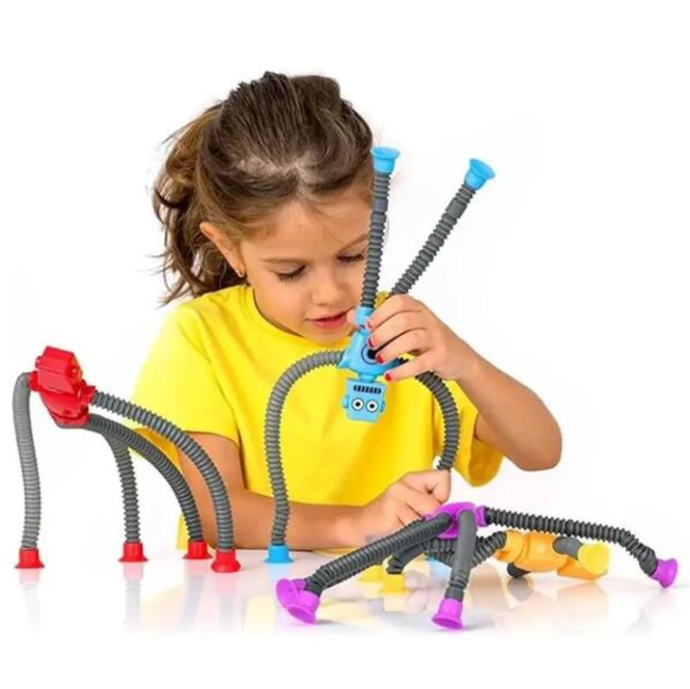 O Robo Pop It é um brinquedo sensorial inovador e divertido, perfeito para todas as crianças. O Robo possui braços feitos de tubos que se esticam e seus braços e pés possuem ventosas, permitindo fixar em diversas superfícies lisas. Com design divertido e chamativo, conta com luz colorida que acende ao chacoalhar o boneco. Ajuda no alívio de estresse e foco melhorando a concentração da criança.