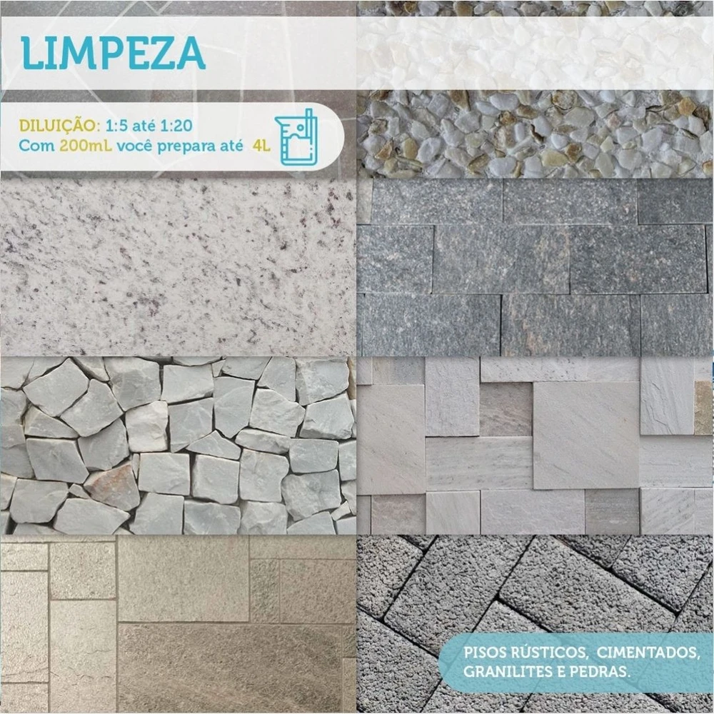Diluir 1 litro de Limpa Pedra para cada 05 litros de água.