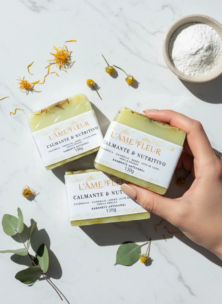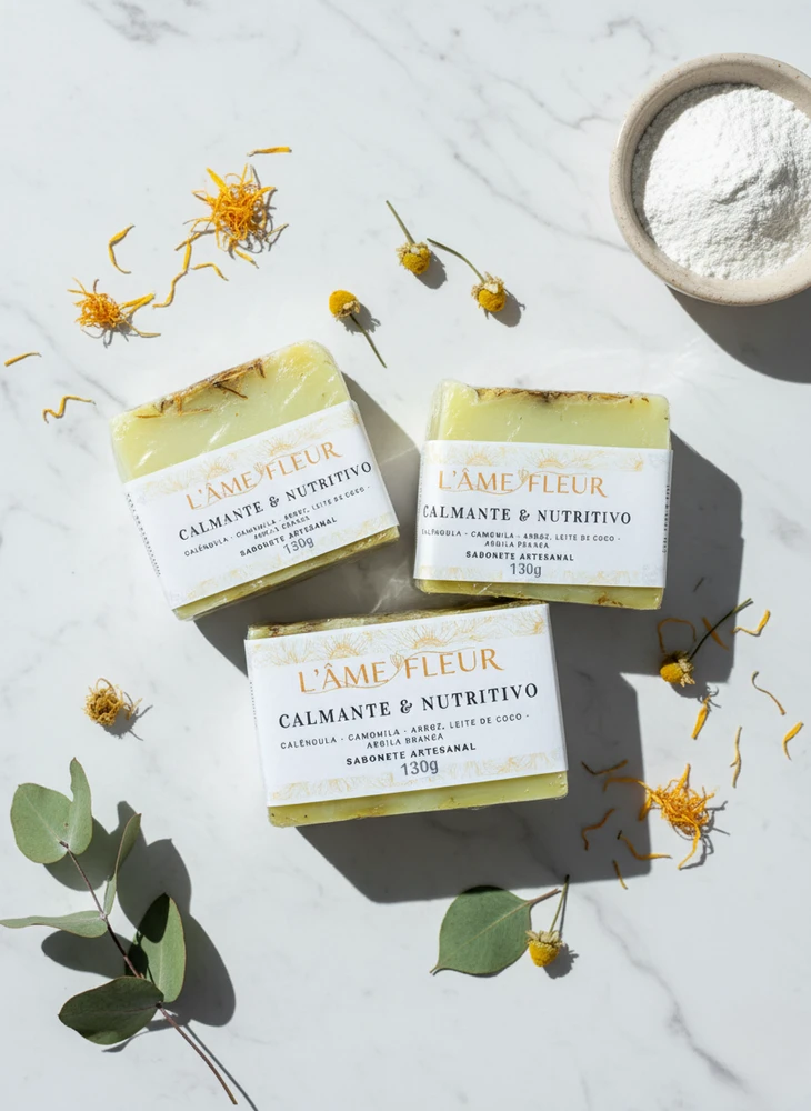 Sua pele merece uma pausa. Nosso Sabonete Calmante & Nutritivo foi cuidadosamente formulado para proporcionar uma limpeza suave e cheia de carinho. A combinação de ingredientes naturais age em harmonia para acalmar e nutrir, sem agredir ou ressecar.