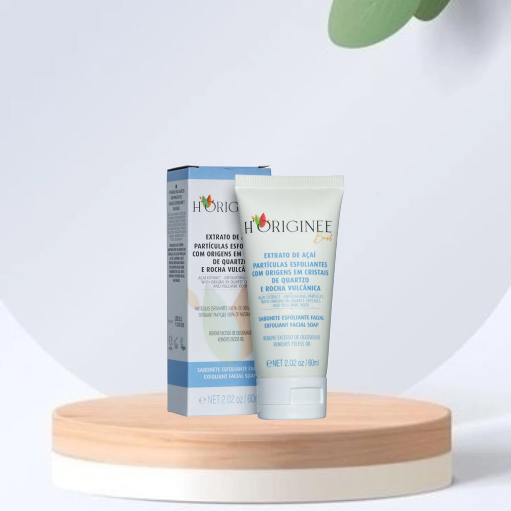 Sabonete Esfoliante Facial Vegano e Orgânico com Extrato de Açaí. Formulado com cristais de quartzo e rocha vulcânica para esfoliação profunda, remoção de impurezas e controle da oleosidade. Proporciona renovação celular, frescor e luminosidade. Rico em antioxidantes, possui 96% de ingredientes naturais e detergentes de origem vegetal. Hipoalergênico e livre de silicones, corantes e petrolatos. Uso diário: massageie no rosto úmido com movimentos circulares e enxágue. Embalagem de 60ml.