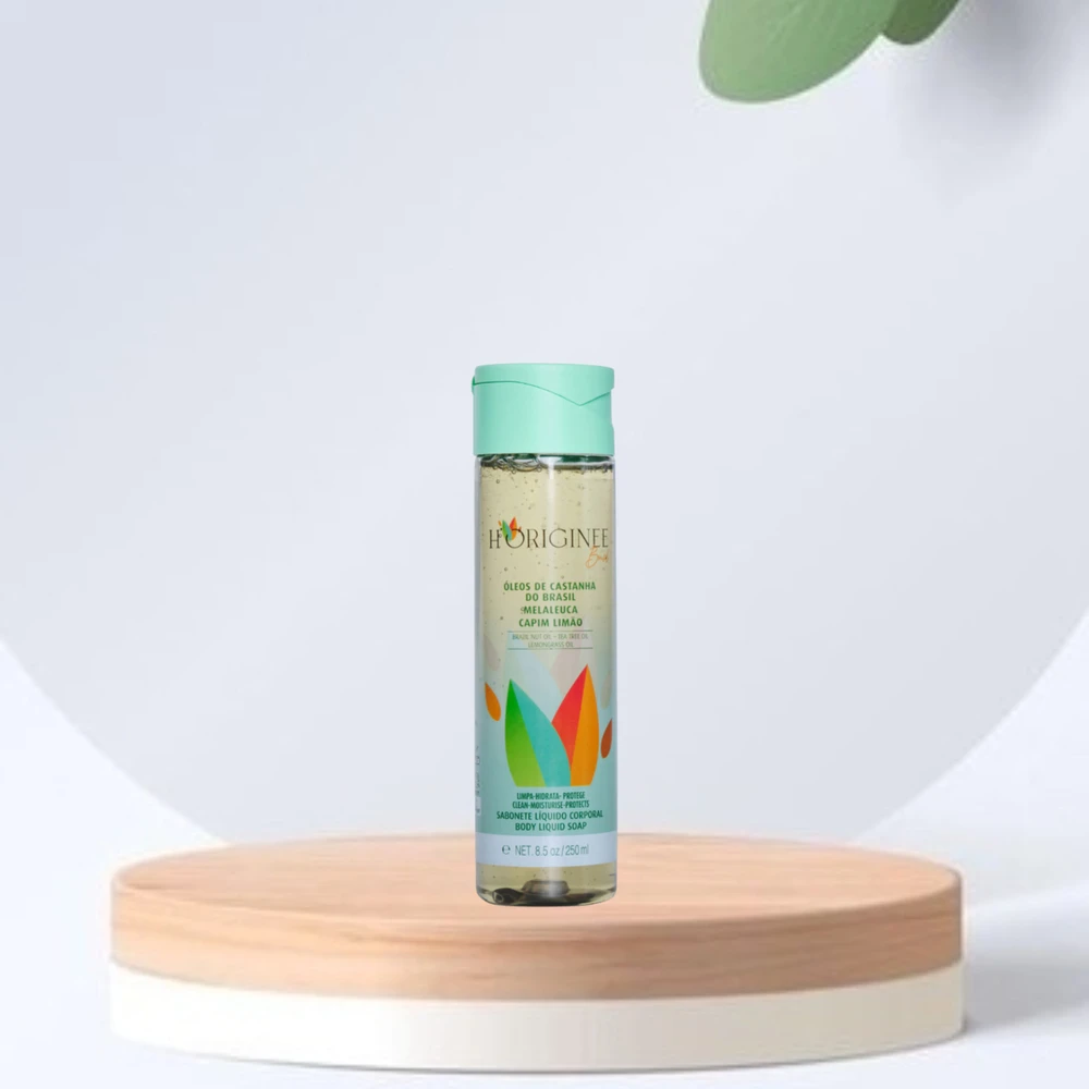 Sabonete Líquido Corporal Vegano e Orgânico com Castanha do Brasil, Melaleuca e Capim-Limão (250ml). Oferece limpeza suave, ação antisséptica e refrescante, protegendo a barreira cutânea com agentes prebióticos. Ideal para peles sensíveis, garante hidratação e purificação sem ressecar. Fórmula 98% natural, hipoalergênica e livre de silicones, corantes ou petrolatos. Proporciona frescor duradouro e bem-estar. Uso: aplique no corpo úmido com movimentos circulares (exceto rosto) e enxágue.