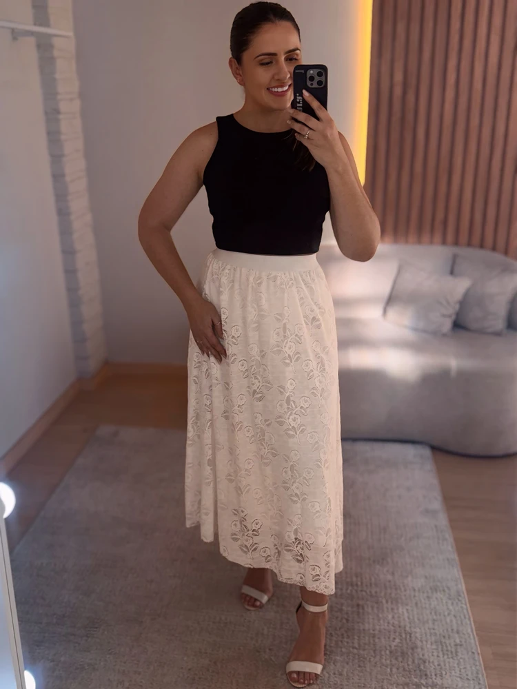 Uma saia versátil, perfeita para quem busca charme, conforto e sofisticação em uma única peça.