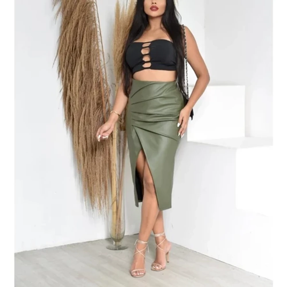 Especificações: - Tamanhos: 36 ao 44. - Material: Couro Ecológico. - Elasticidade: Média. - Itens inclusos: 01 saia midi.