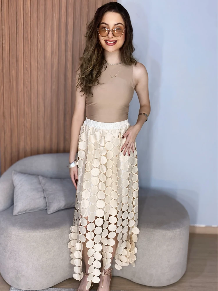 A Saia Longa Discos Texturizados é aquela peça diferente, sofisticada e cheia de personalidade que transforma qualquer look! Composta por aplicações circulares por toda a extensão, ela cria um efeito 3D leve, moderno e super elegante. O caimento fluido garante movimento e charme, enquanto o design artesanal valoriza a produção e deixa o visual único.