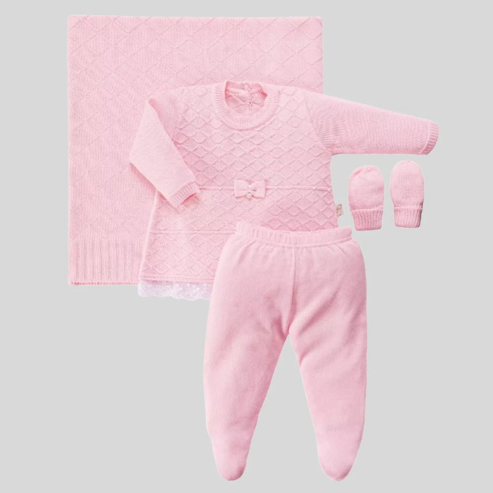 Saída de Maternidade em tricô Rosa conforto e delicadeza para os primeiros dias da sua bebê.