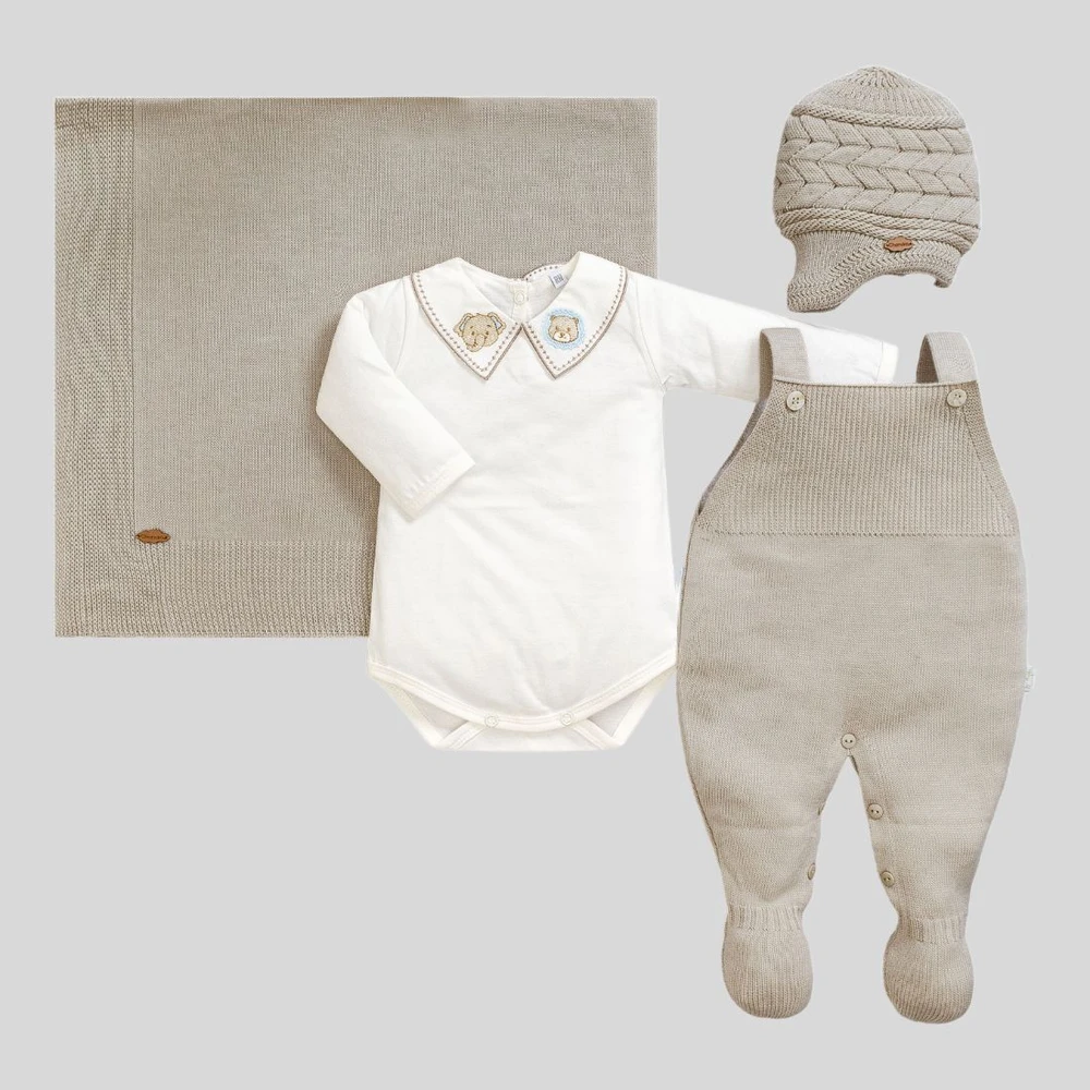 Este conjunto completo inclui jardineira, body com gola bordada, touca e manta em tricô suave, perfeitos para proteger seu bebê nas primeiras aventuras fora do hospital.