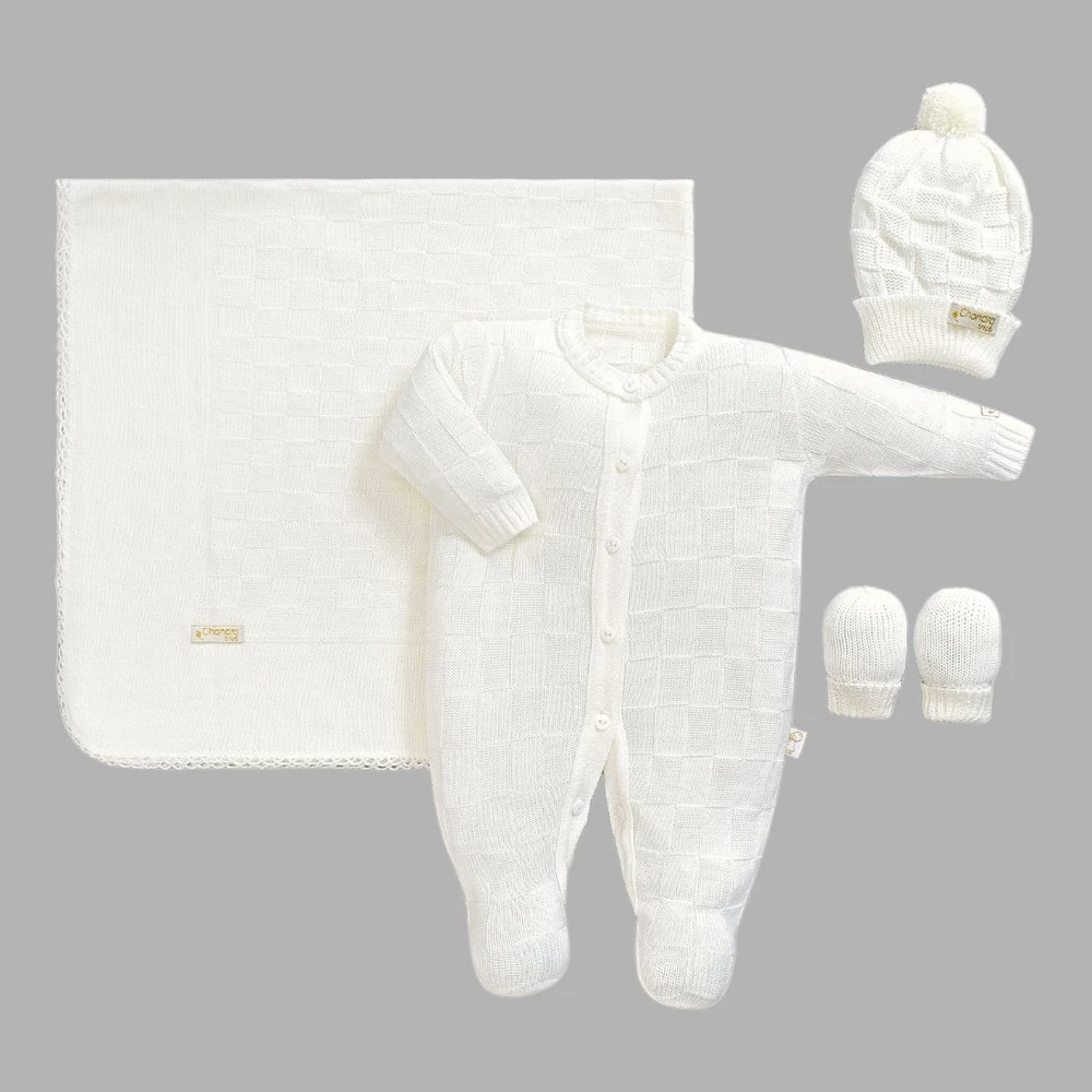 Produzido em tricô macio, este conjunto inclui macacão com pezinho, touca, luvas e manta, garantindo proteção completa contra o frio com toque suave que respeita a pele sensível do bebê.