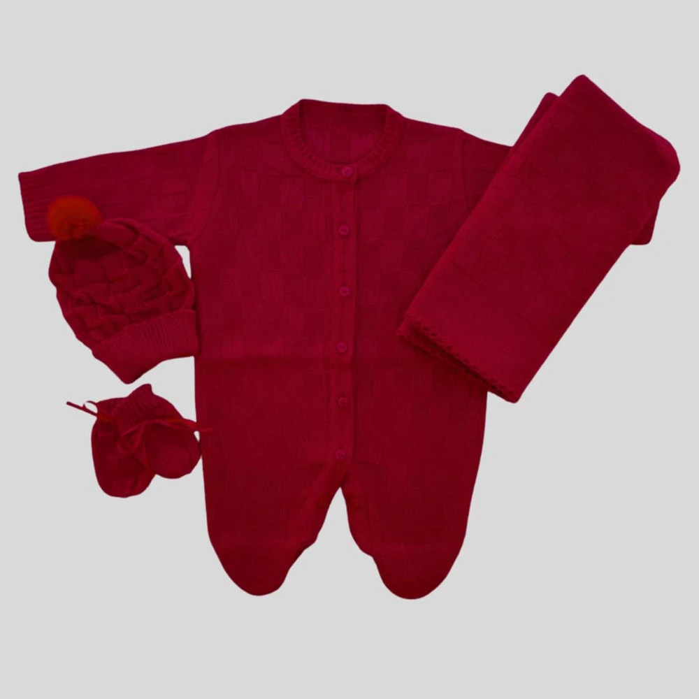 Saída de maternidade para bebê em tricô vermelho, o conjunto perfeito para acolher seu recém-nascido com conforto e estilo.