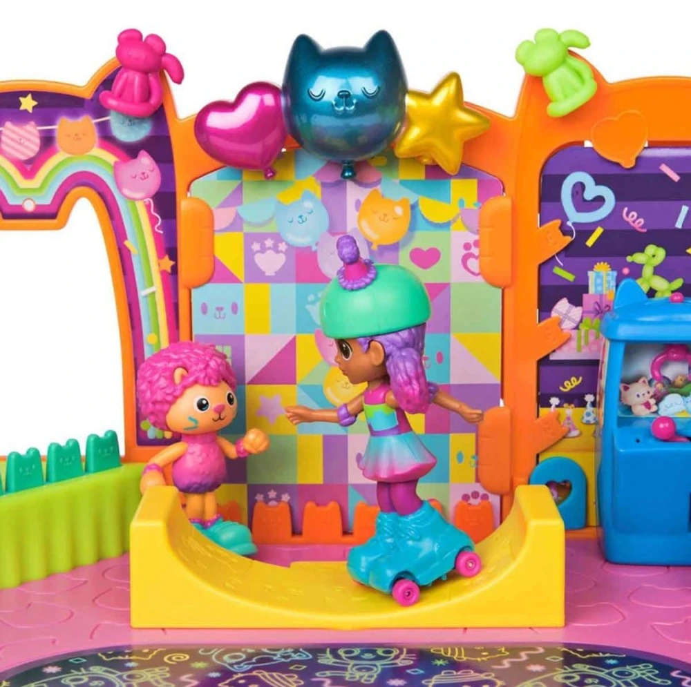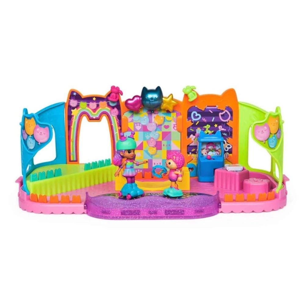 Entre no mundo mágico da Gabby?s Dollhouse com o Playset Sala de Festas da Gabby. Este conjunto inclui a exclusiva Gabby patinadora de 10 centímetros e o Marty patinador, ambos com patins funcionais. Decore a Sala de Festas com acessórios e móveis de casa de bonecas, depois divirta-se. Para ainda mais diversão, prenda a Sala de Festas na casa de bonecas de até 4 andares de altura (vendida separadamente).