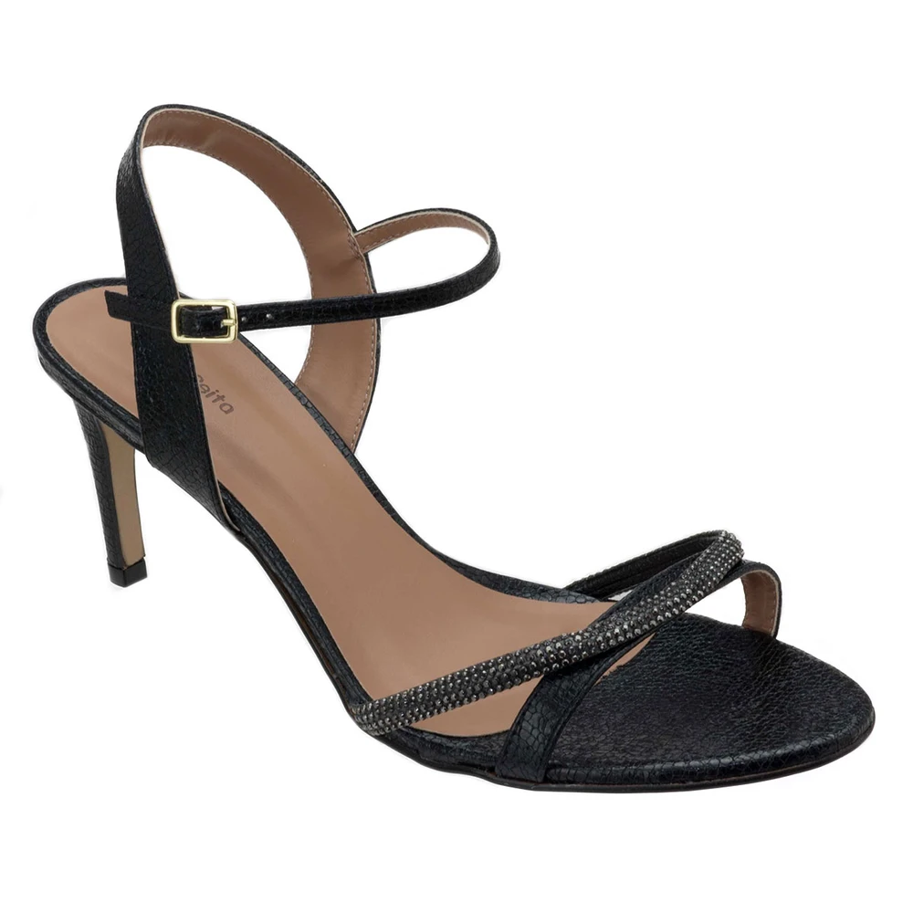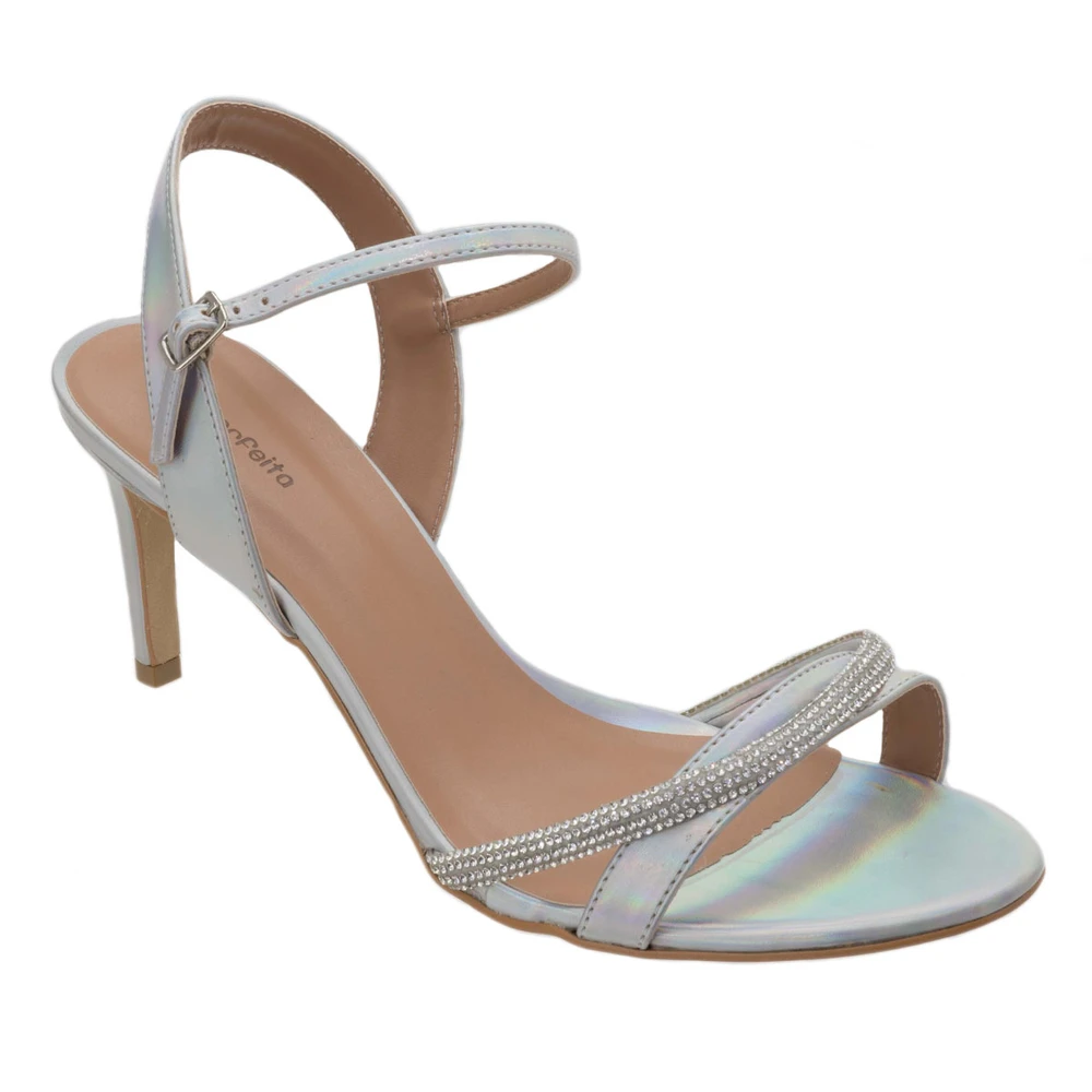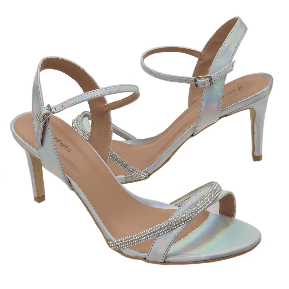 Sandália em laminado sintético com solado em borracha antiderrapante e saltinho de 9,5 cm de altura. Com detalhes em strass, muito delicada e elegante.