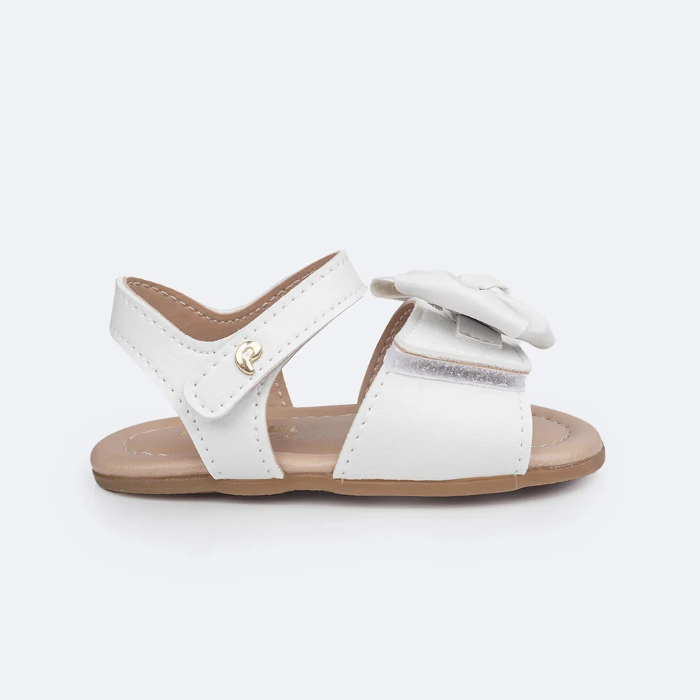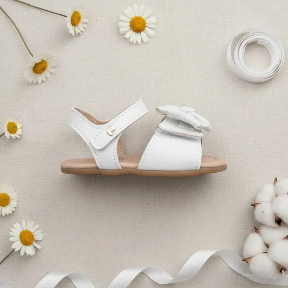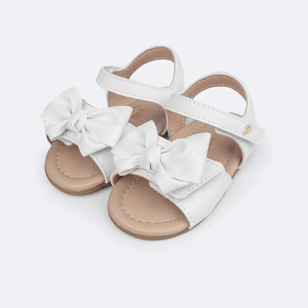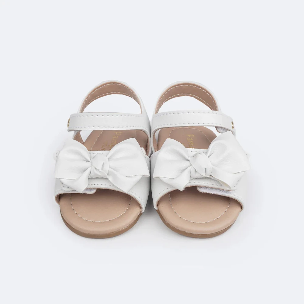 Sandália de bebê feminina em sintético branco com aplicação de laço duplo na parte frontal, uma fofura. Sandália com palmilha forrada e enchimento de espuma, dando conforto aos pezinhos sem interferir no desenvolvimento natural. A sandália infantil feminina é fácil de calçar, facilitando o dia a dia da mamãe! O solado é emborrachado e flexível, deixando as nossas bebês com mais confiança e segurança nos primeiros passinhos.