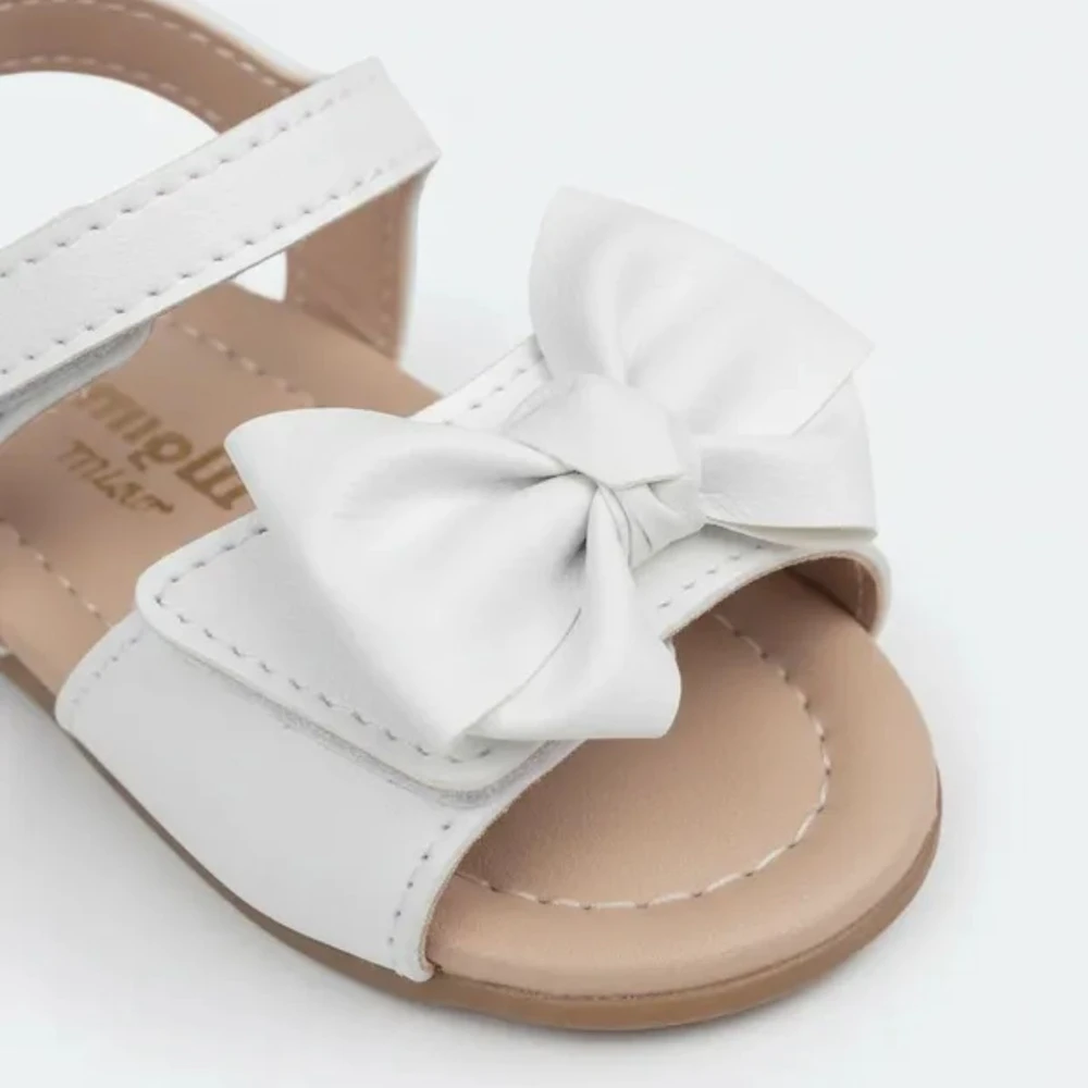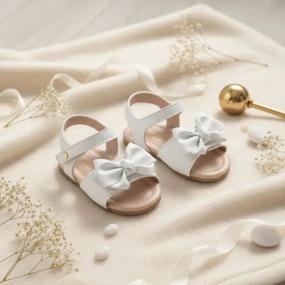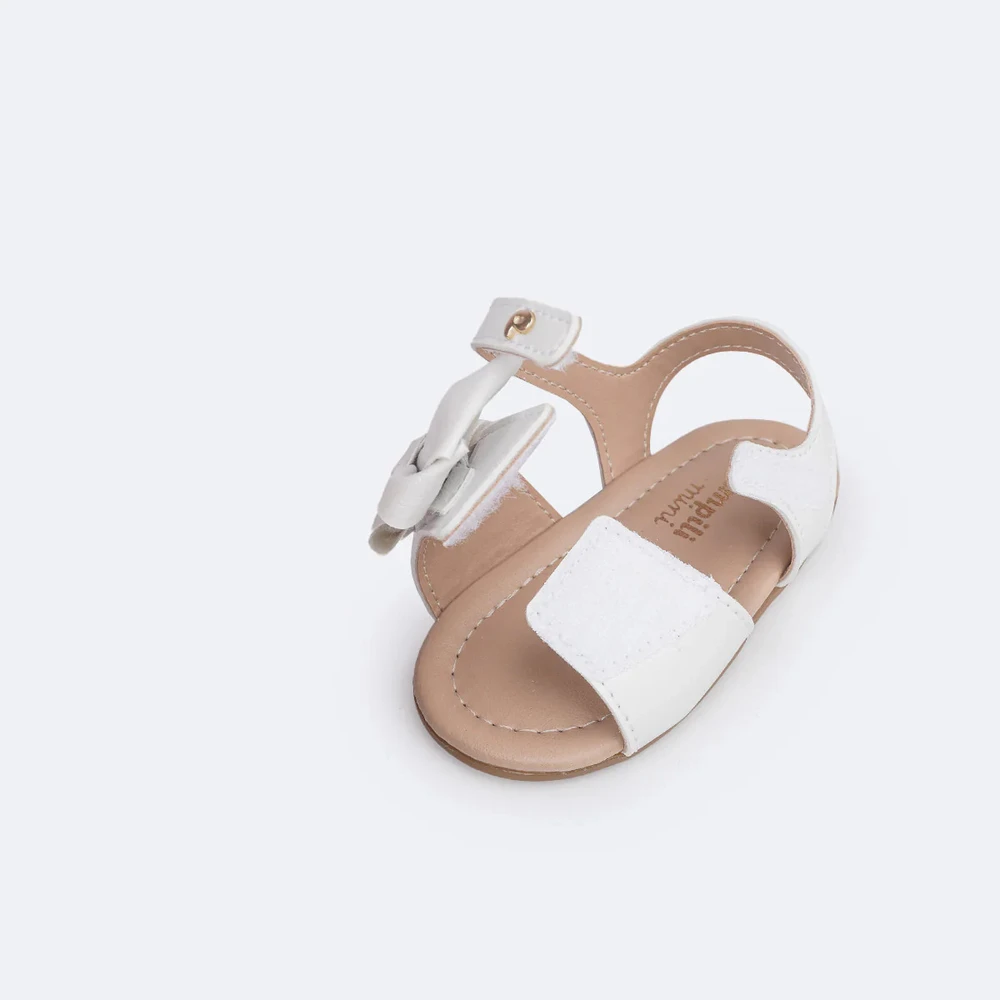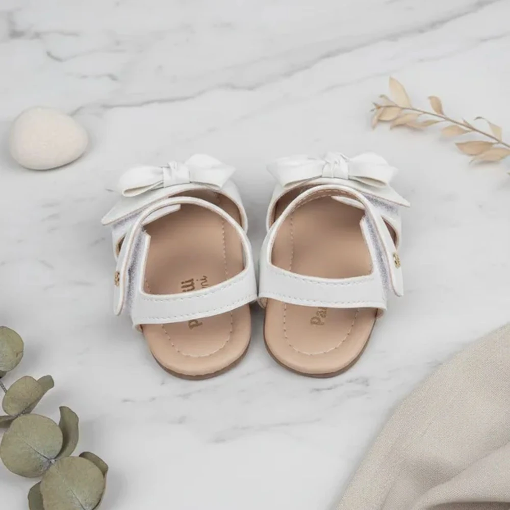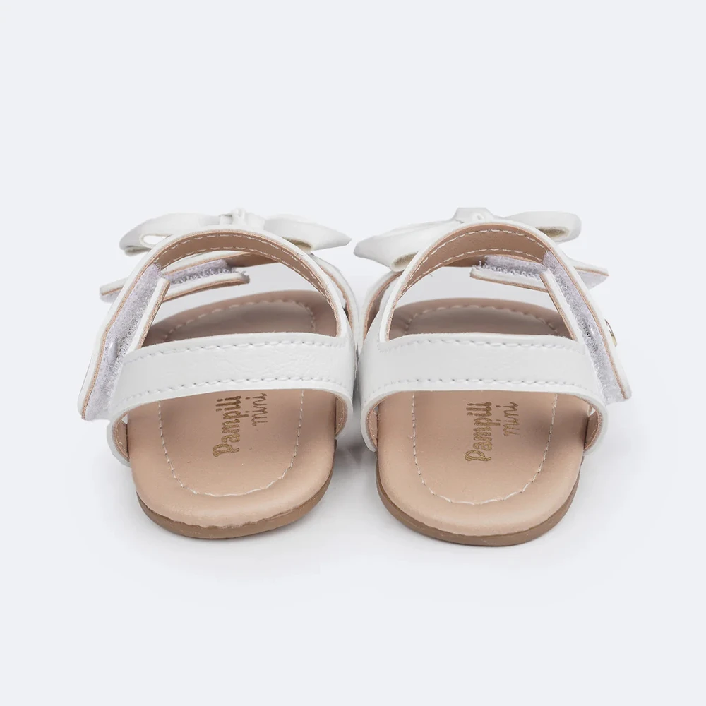 Sandália de bebê feminina em sintético branco com aplicação de laço duplo na parte frontal, uma fofura. Sandália com palmilha forrada e enchimento de espuma, dando conforto aos pezinhos sem interferir no desenvolvimento natural. A sandália infantil feminina é fácil de calçar, facilitando o dia a dia da mamãe! O solado é emborrachado e flexível, deixando as nossas bebês com mais confiança e segurança nos primeiros passinhos.