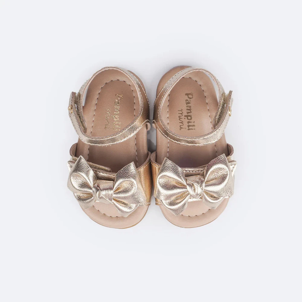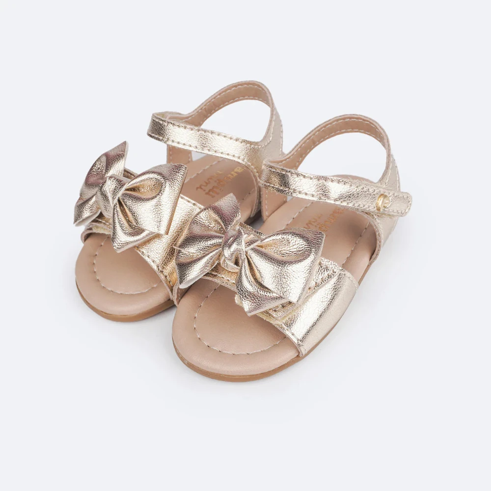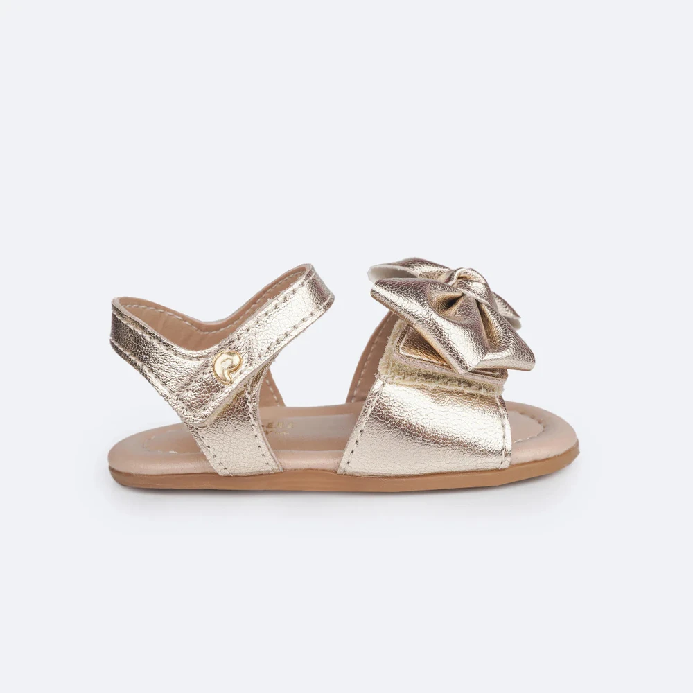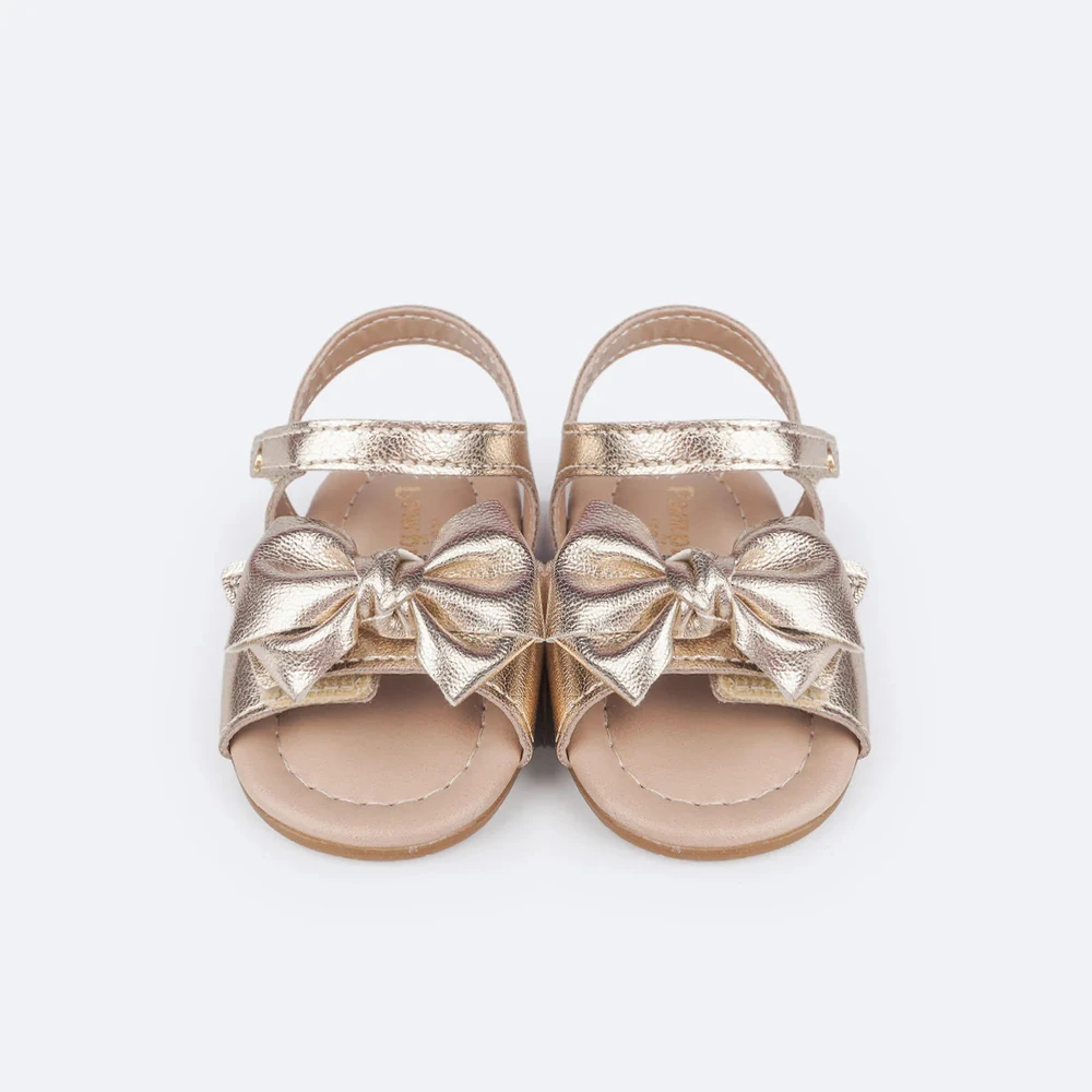 Sandália de bebê feminina em sintético dourado com aplicação de laço duplo na parte frontal, uma fofura. Sandália com palmilha forrada e enchimento de espuma, dando conforto aos pezinhos sem interferir no desenvolvimento natural. A sandália infantil feminina é fácil de calçar, facilitando o dia a dia da mamãe! O solado é emborrachado e flexível, deixando as nossas bebês com mais confiança e segurança nos primeiros passinhos.
