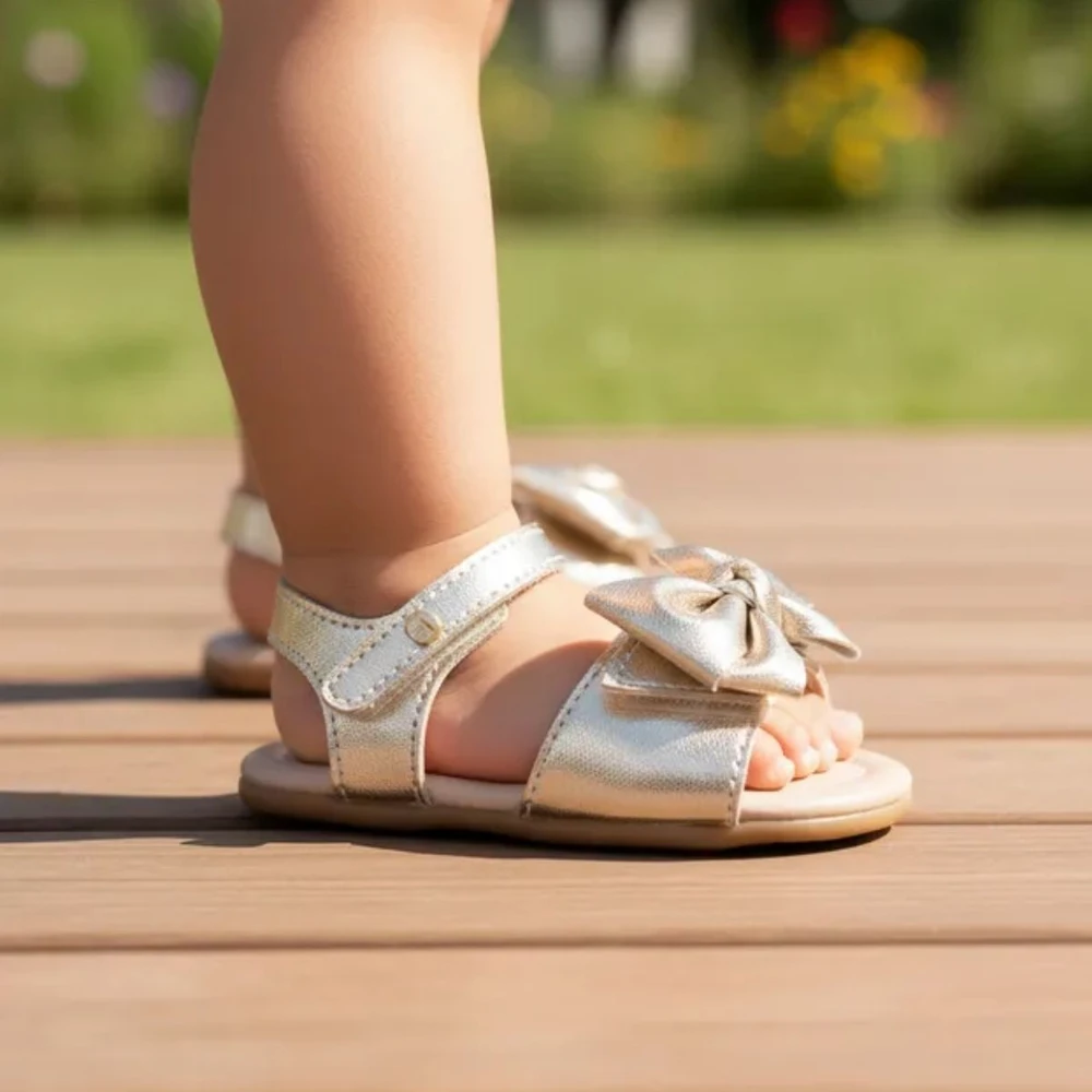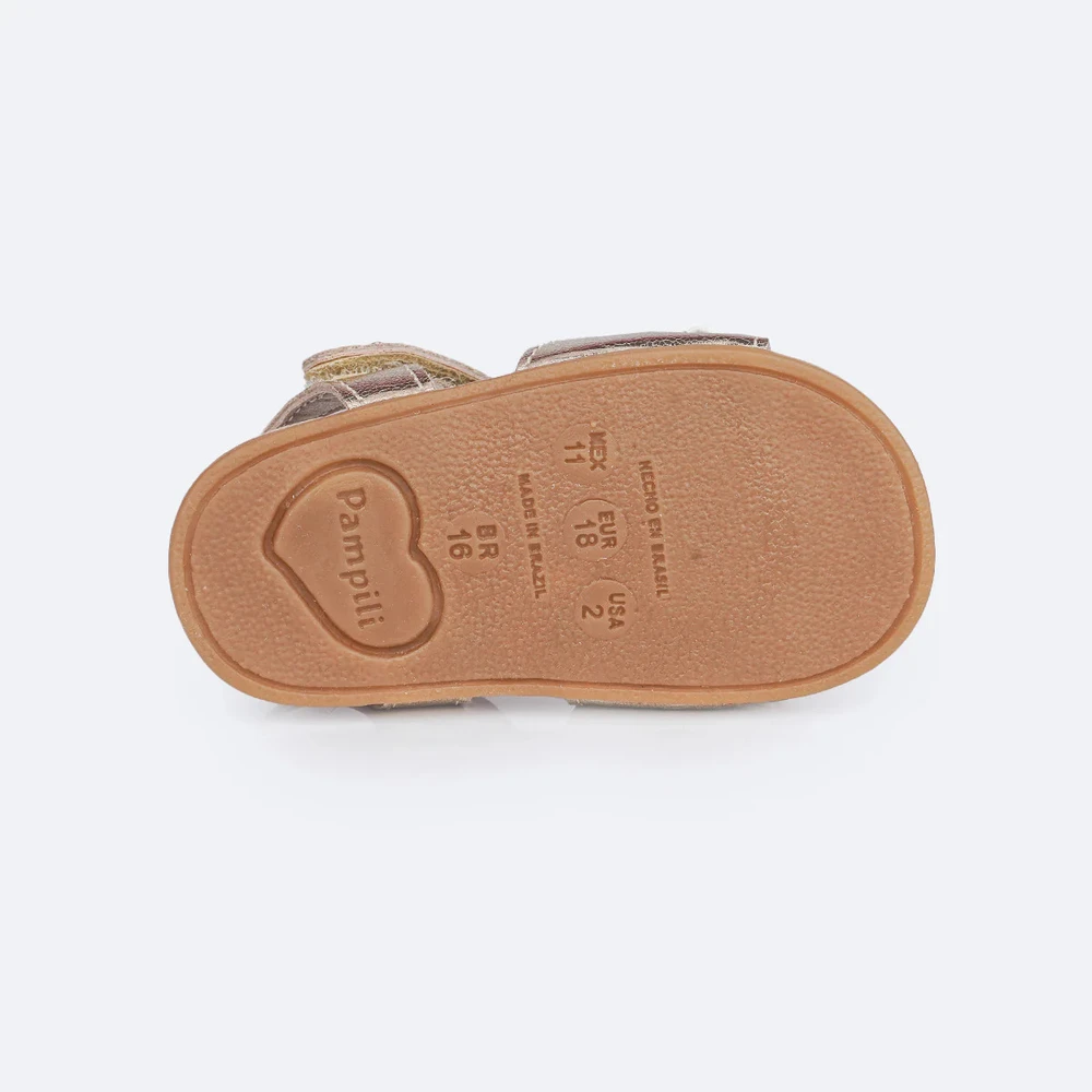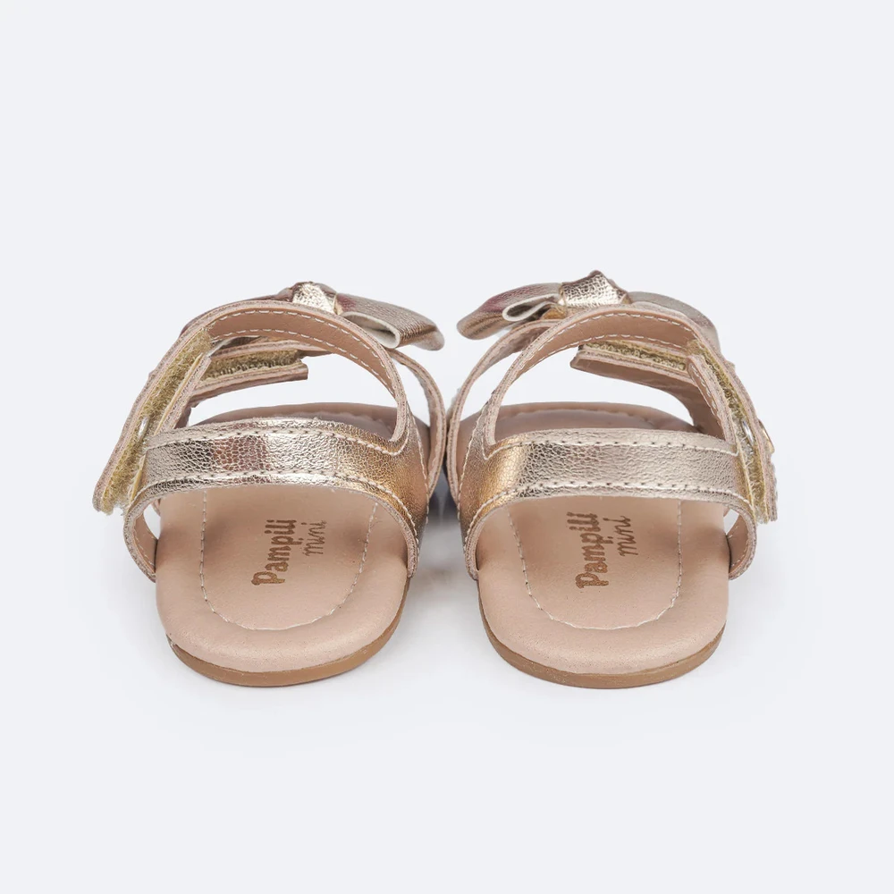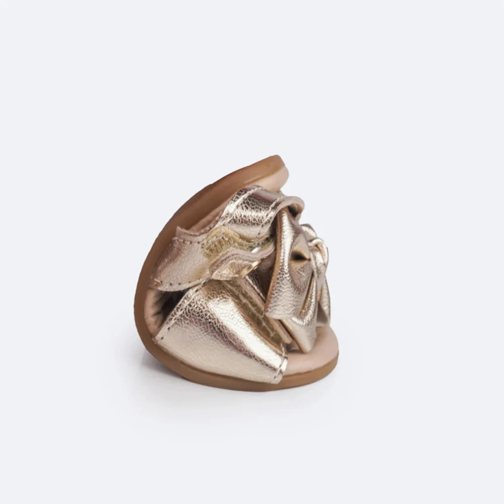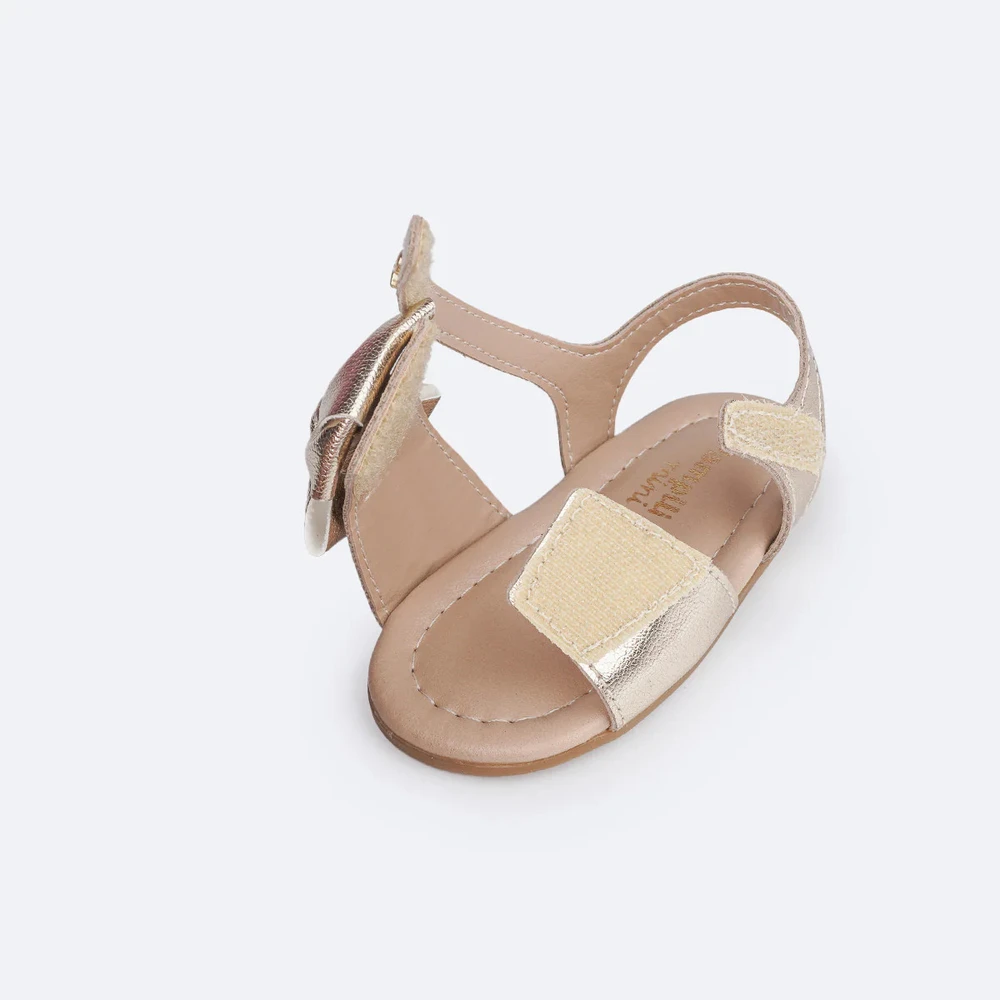 Sandália de bebê feminina em sintético dourado com aplicação de laço duplo na parte frontal, uma fofura. Sandália com palmilha forrada e enchimento de espuma, dando conforto aos pezinhos sem interferir no desenvolvimento natural. A sandália infantil feminina é fácil de calçar, facilitando o dia a dia da mamãe! O solado é emborrachado e flexível, deixando as nossas bebês com mais confiança e segurança nos primeiros passinhos.