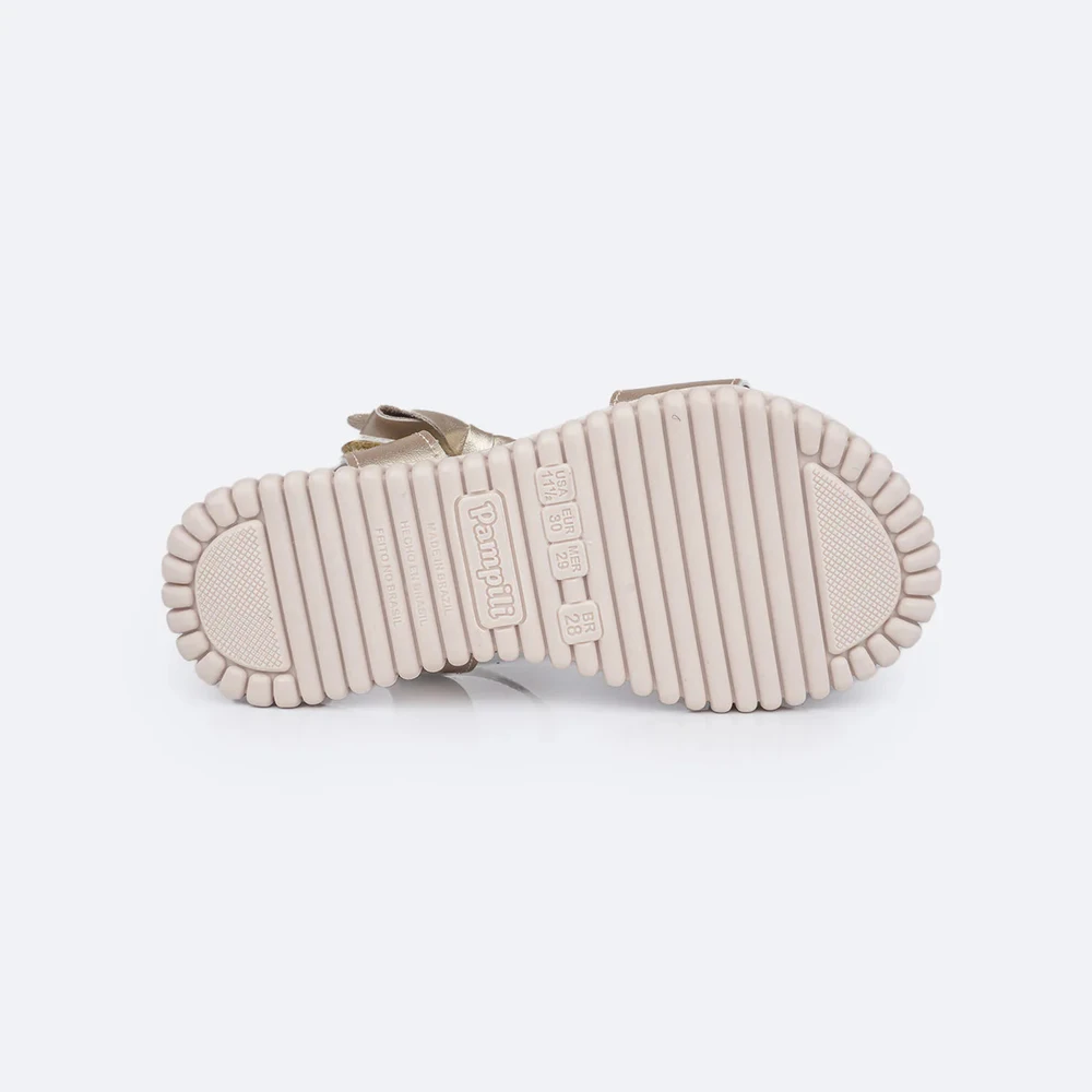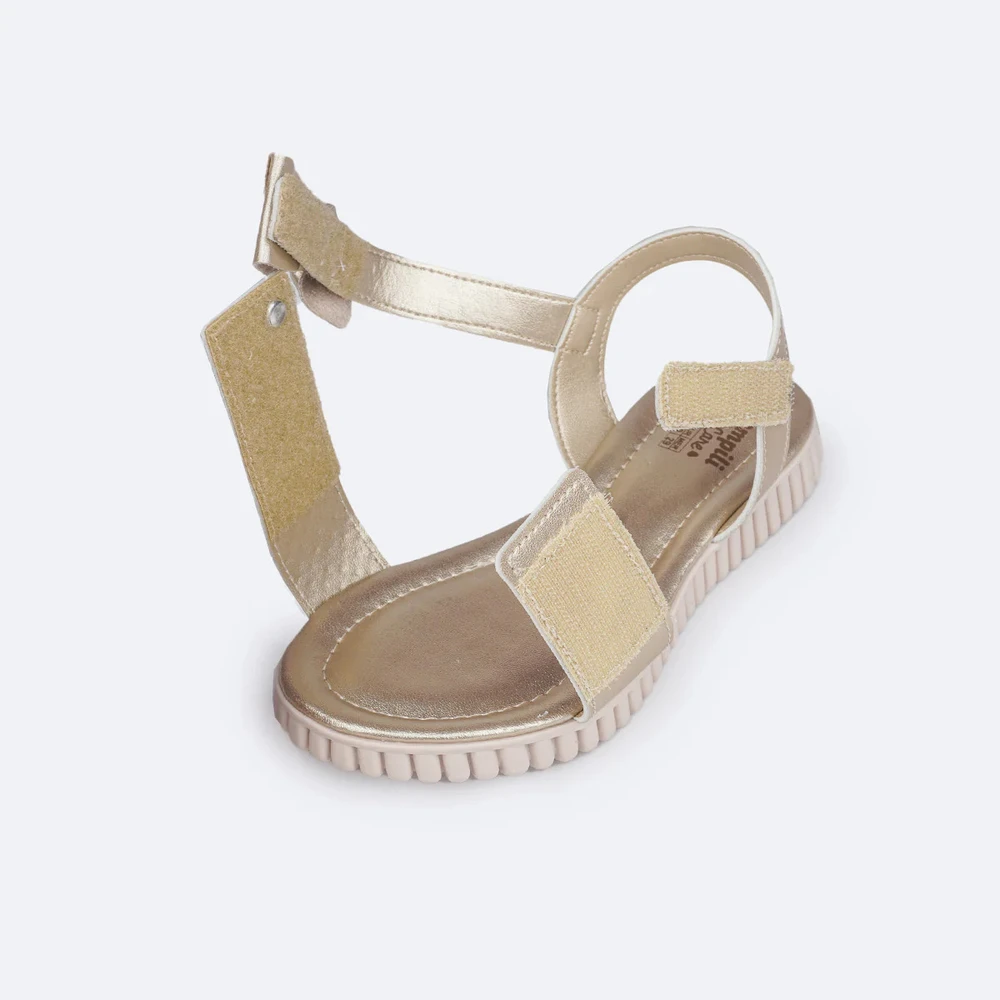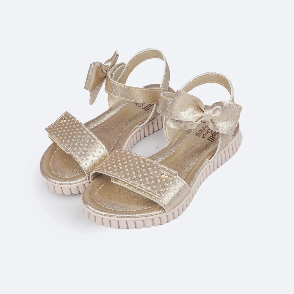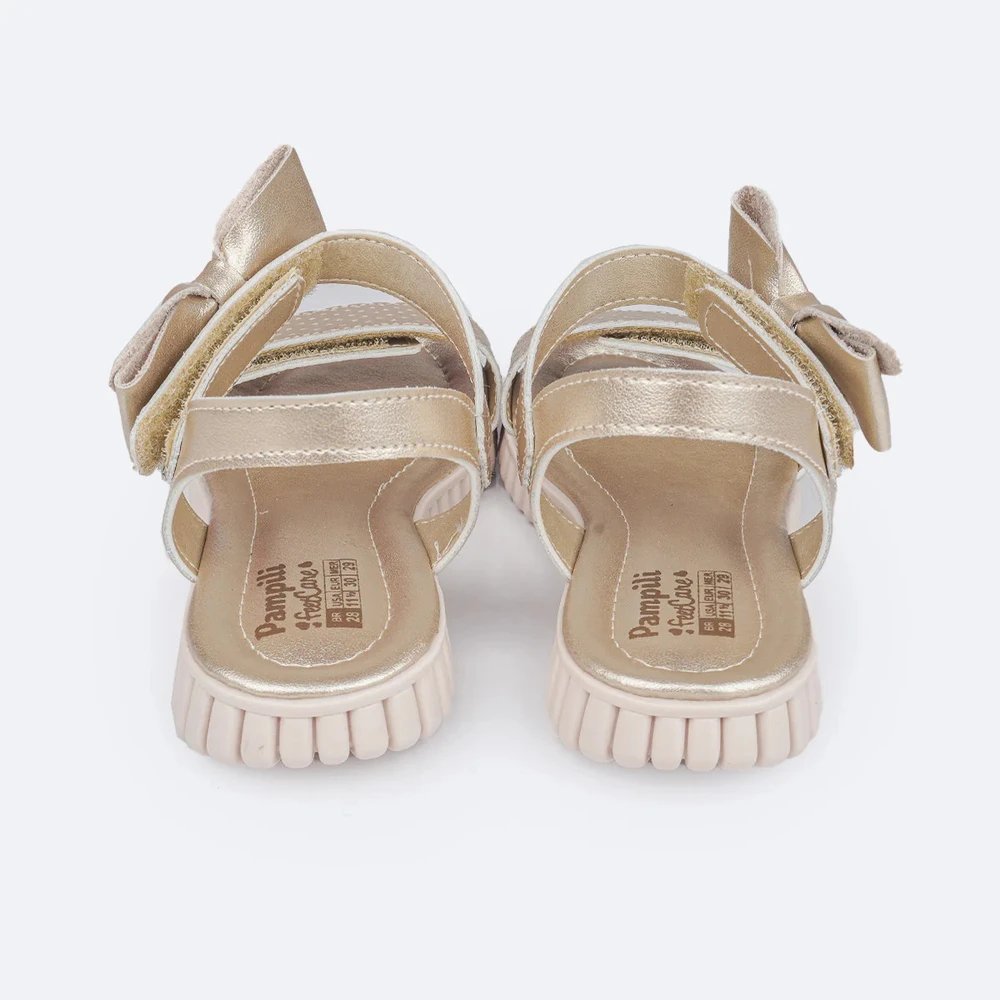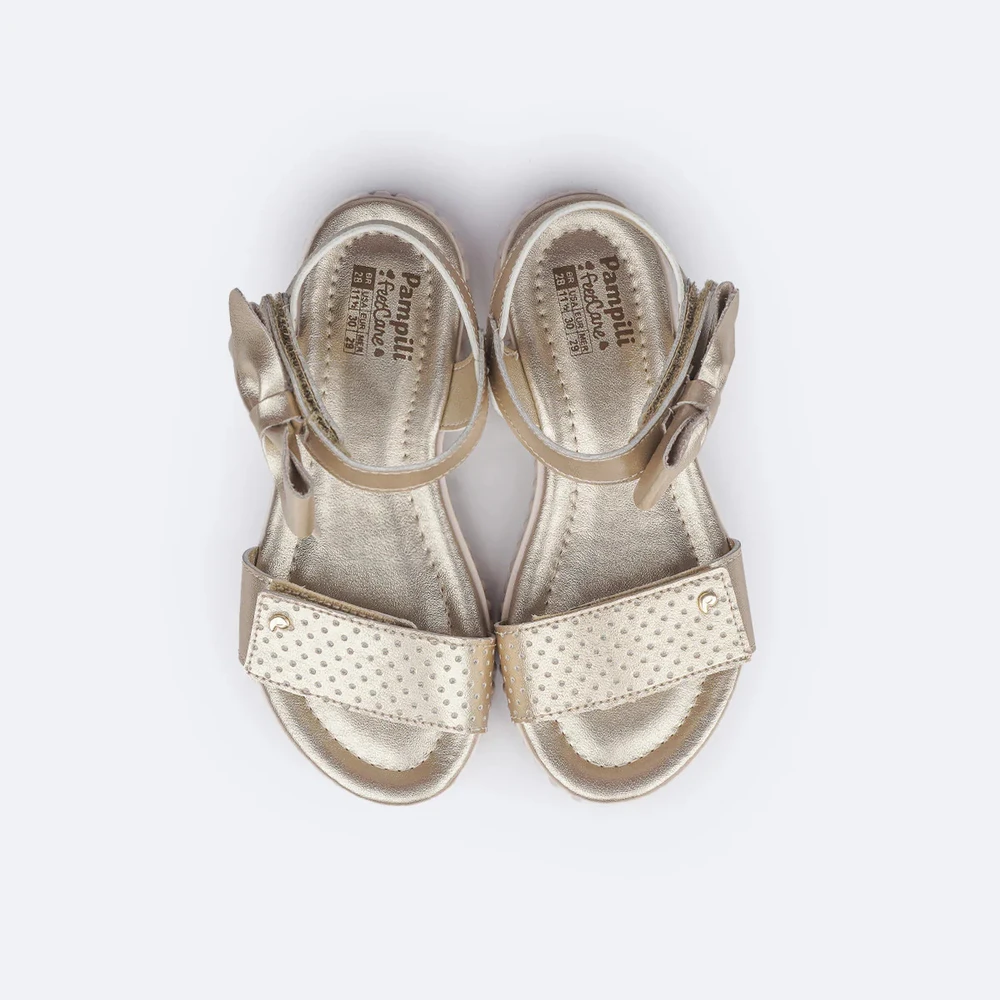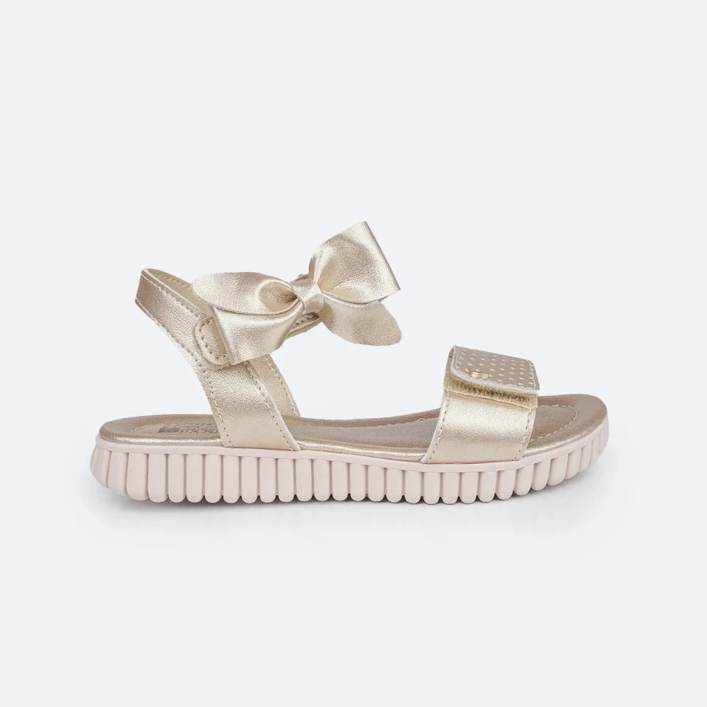 Sandália infantil feminina em sintético dourado, com laço na lateral e perfuros na parte superior, casual e delicada para a menina usar no dia a dia! Papete com palmilha Feet Care, um sistema avançado de fofura, com a densidade ideal para os pés, minimizando impactos. Papete infantil acilitando o calce para as meninas. Solado feito em material emborrachado que possui aderência com o chão, proporcionando flexibilidade, menor desgaste e maior resistência térmica.