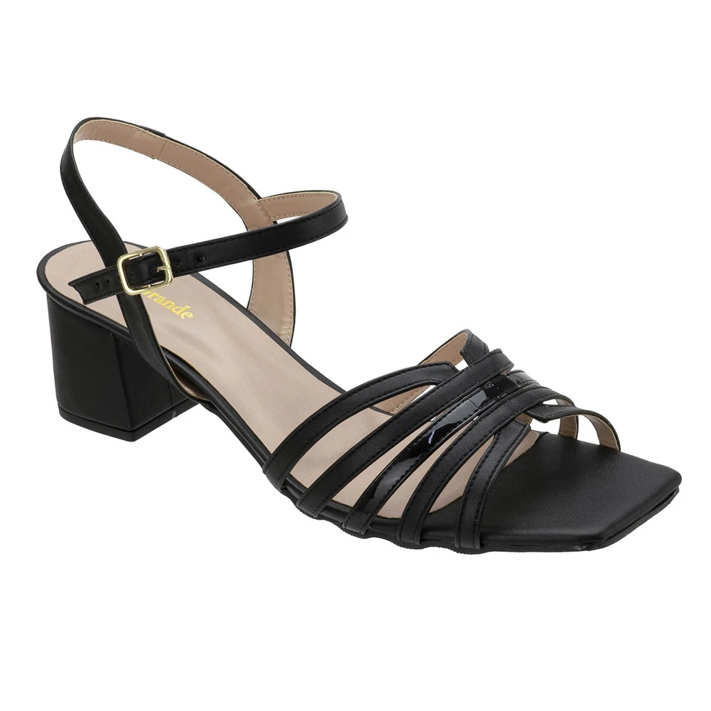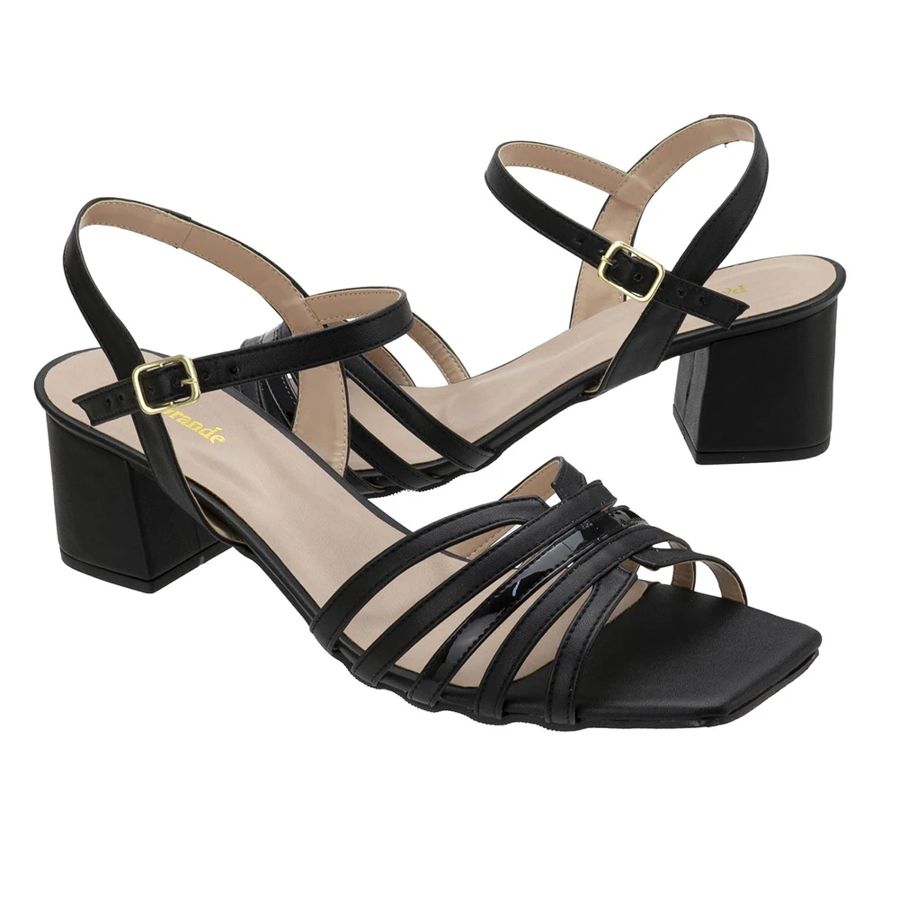 Sandália em couro ecológico, com salto 8 cm com solado em borracha antiderrapante.
