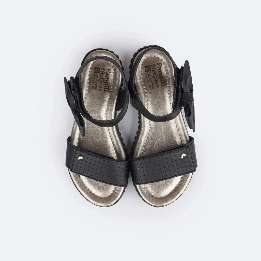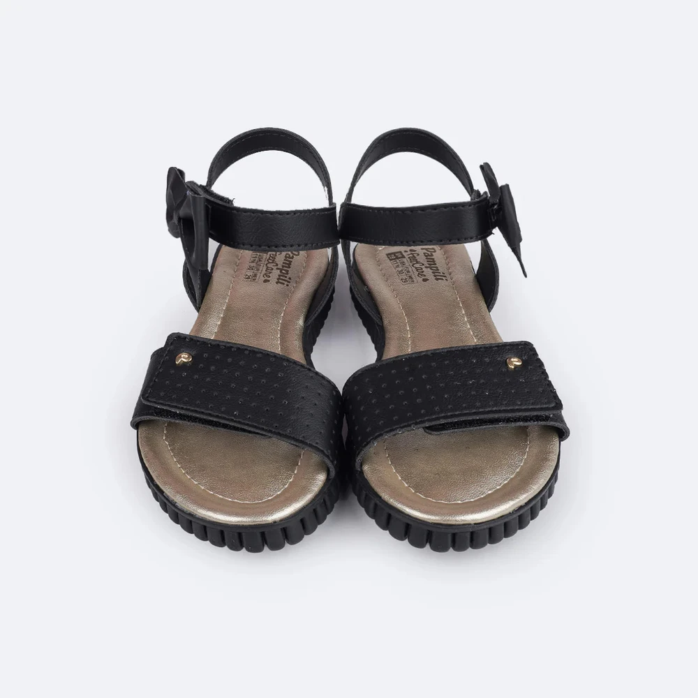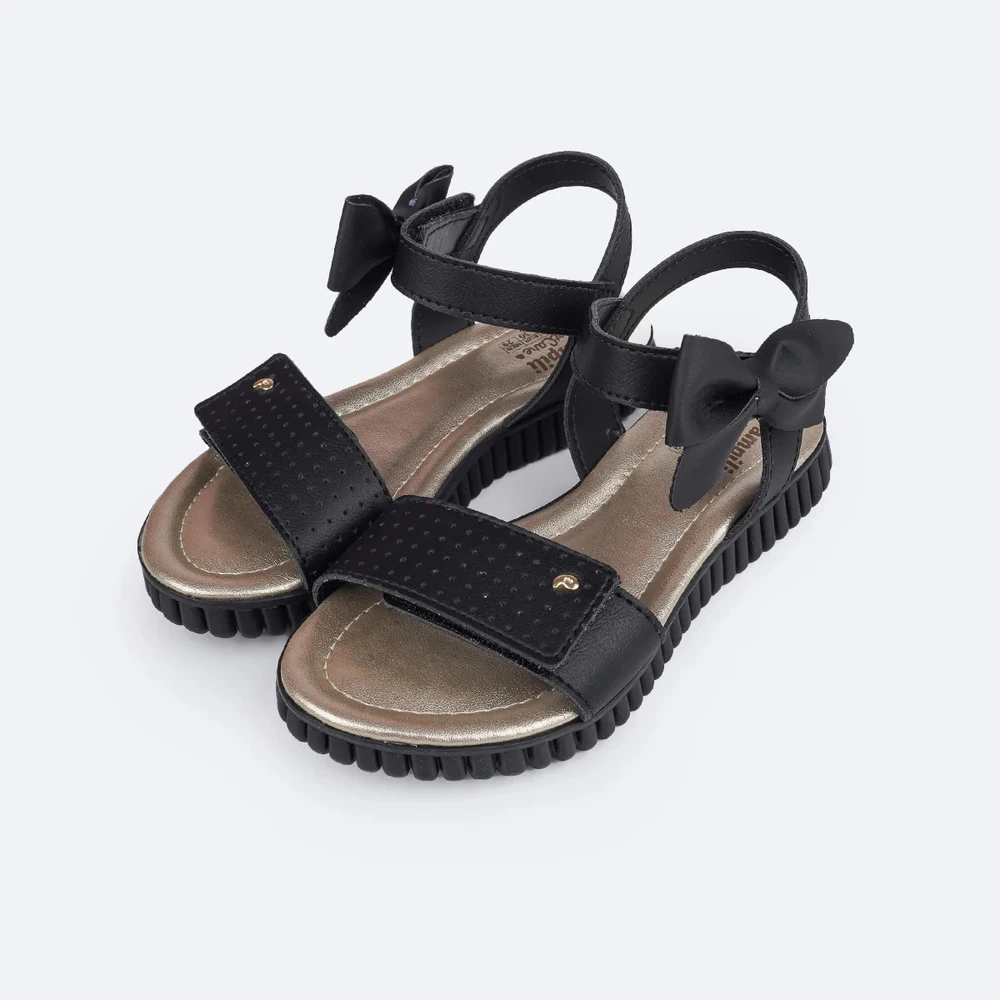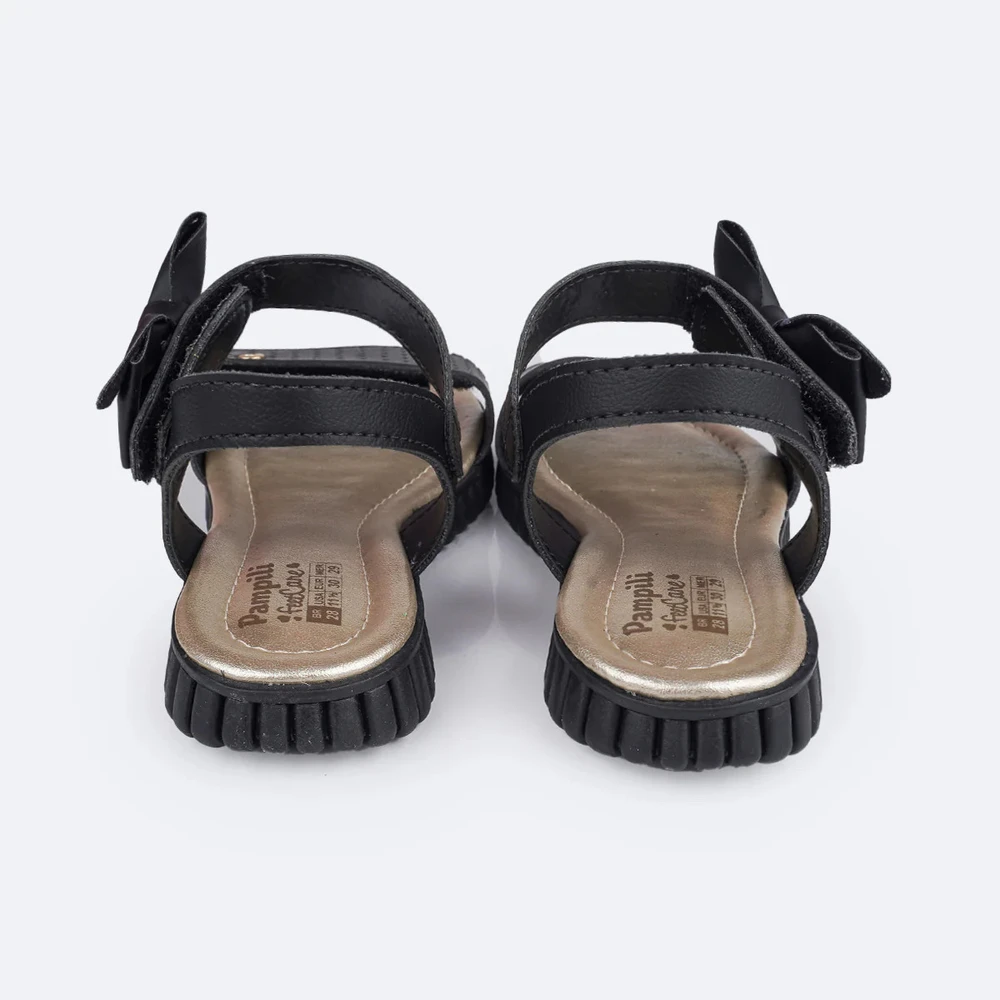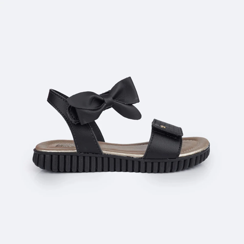 Sandália infantil feita em material sintético e acabamento na cor preta. Trazendo o conforto da papete com sua palmilha com espuma em acabamento metalizado na cor dourada. Novo solado super moderno e extremamente flexível e confortável, permitindo um caminhar mais seguro para a menina. Aplicação de laço para trazer um ar mais romântico á sandália infantil.